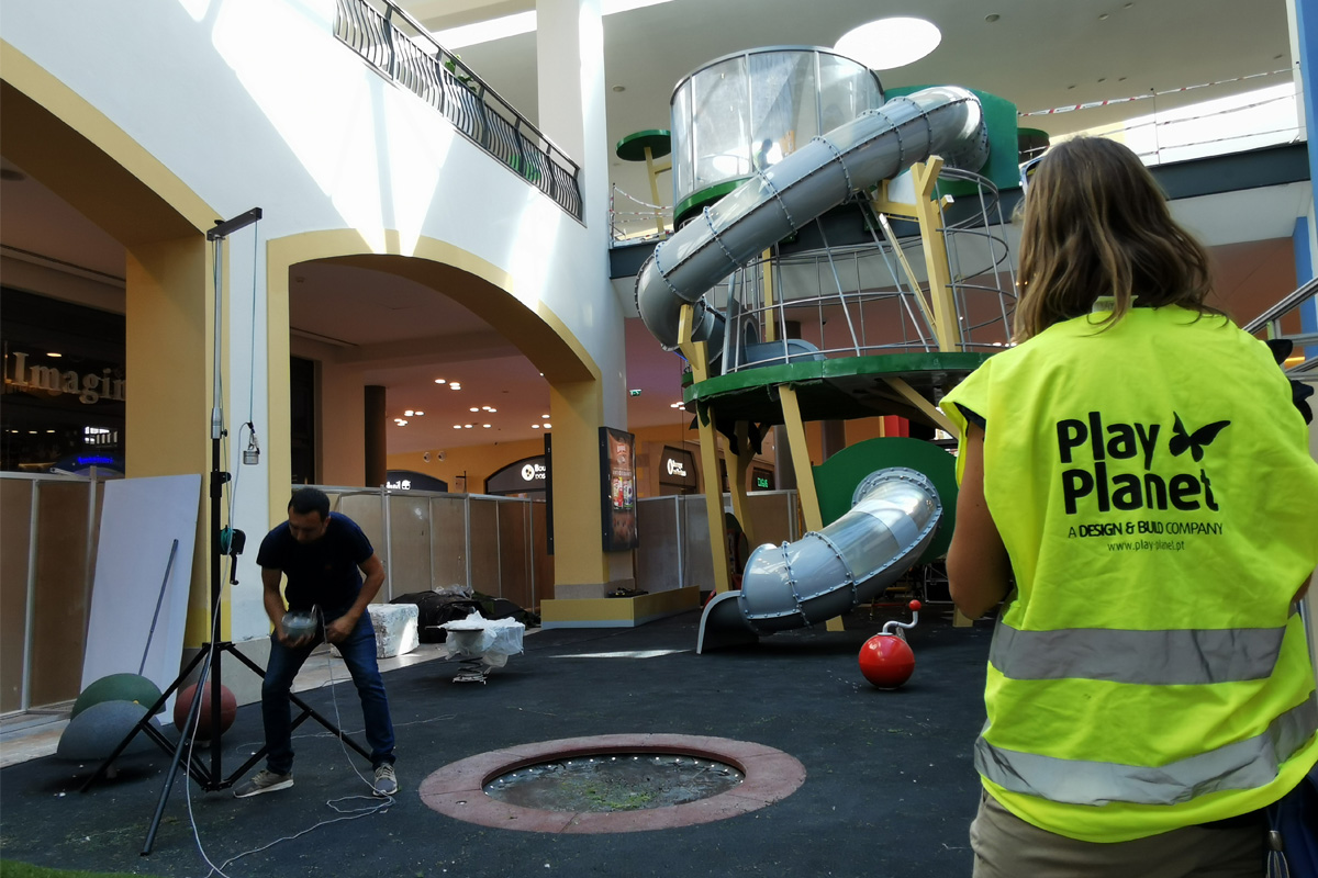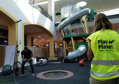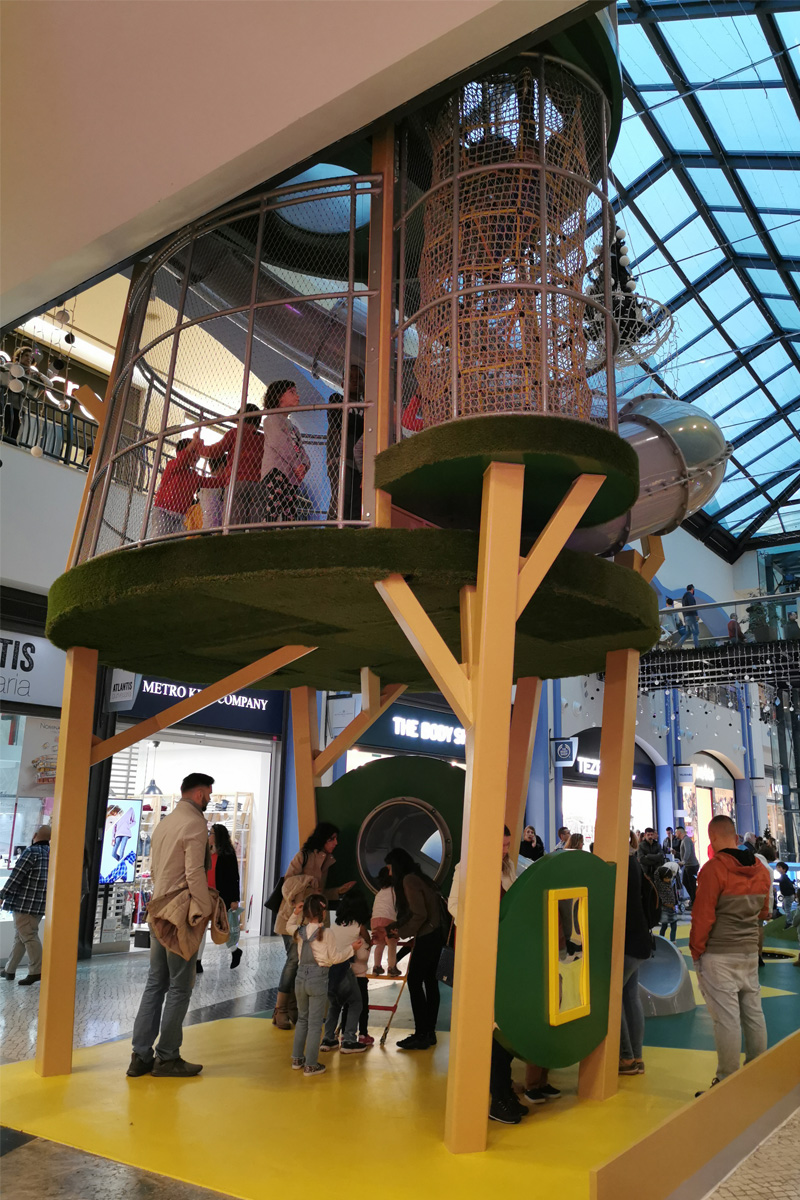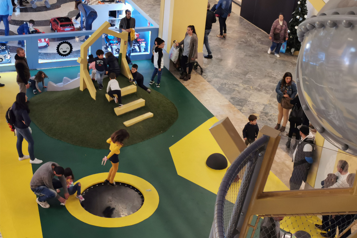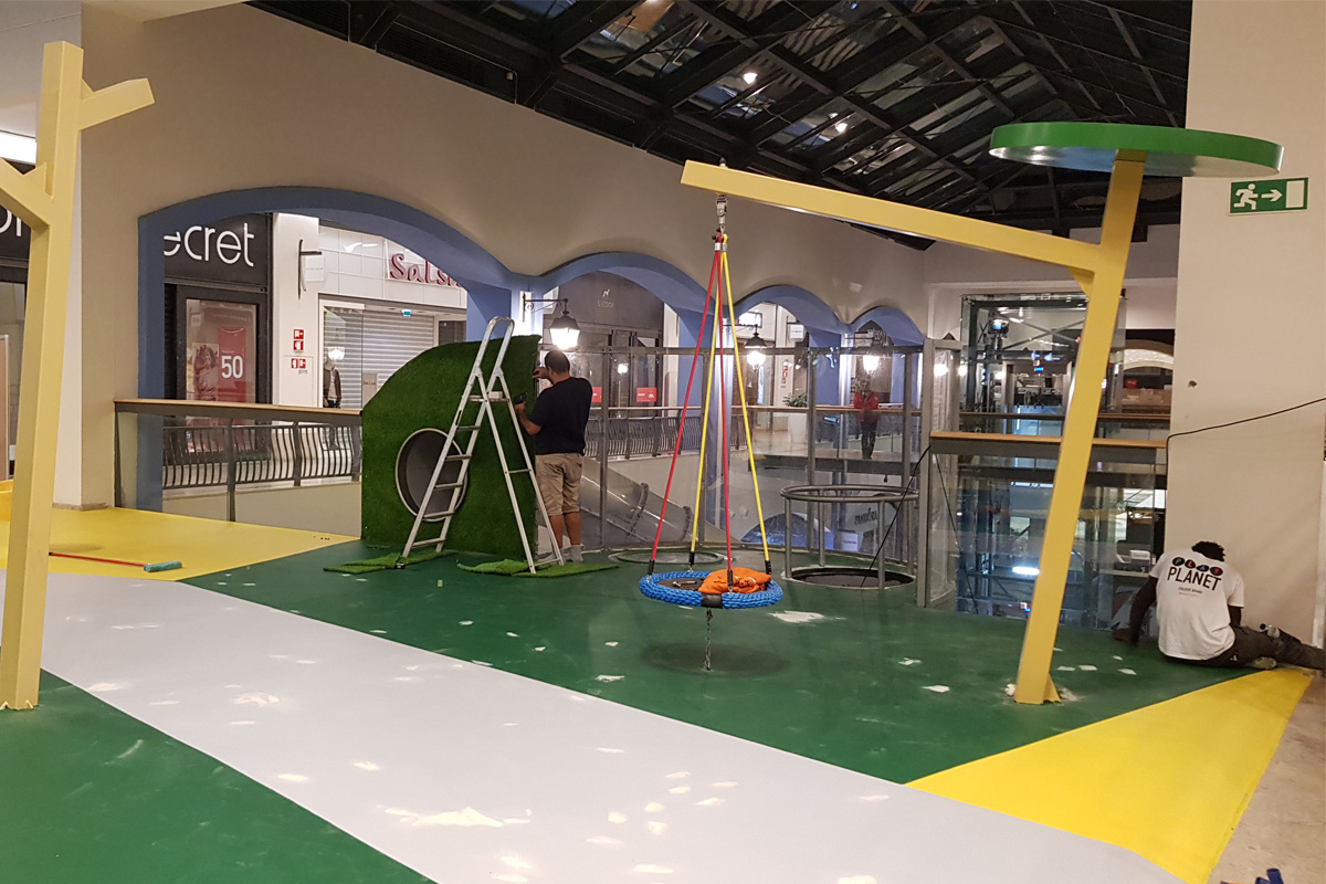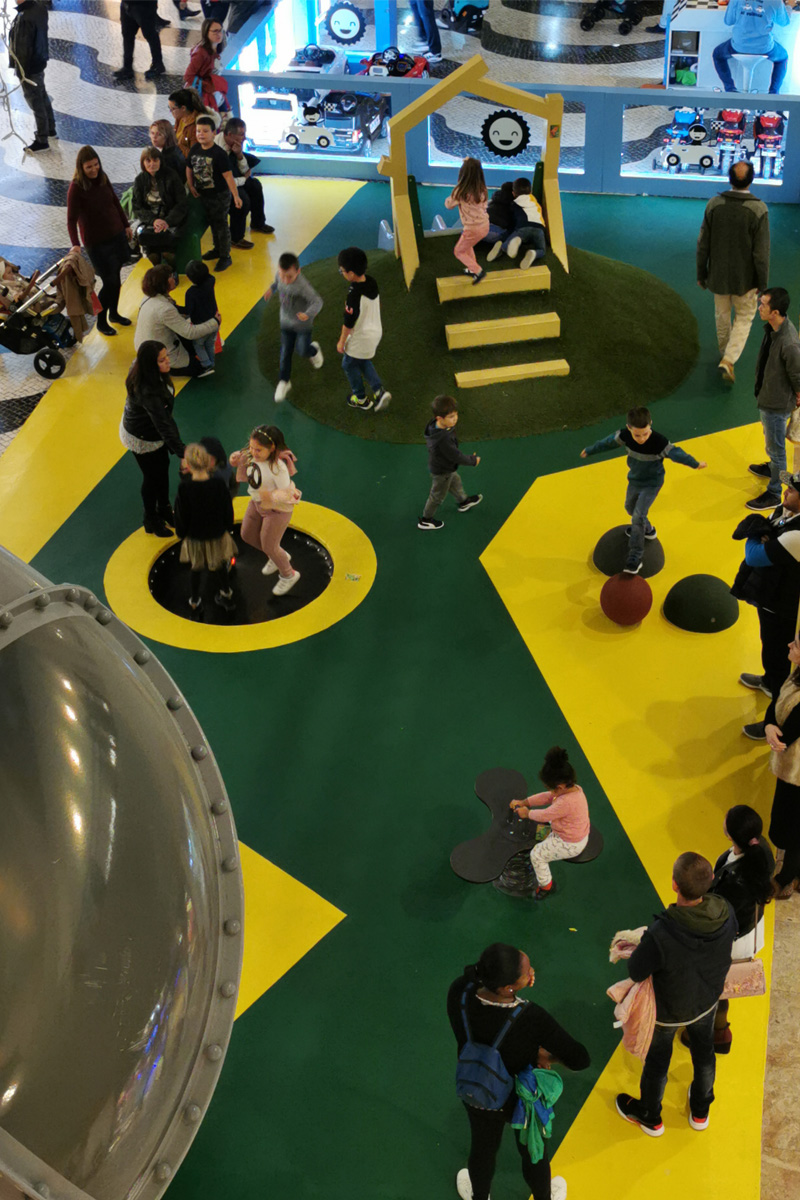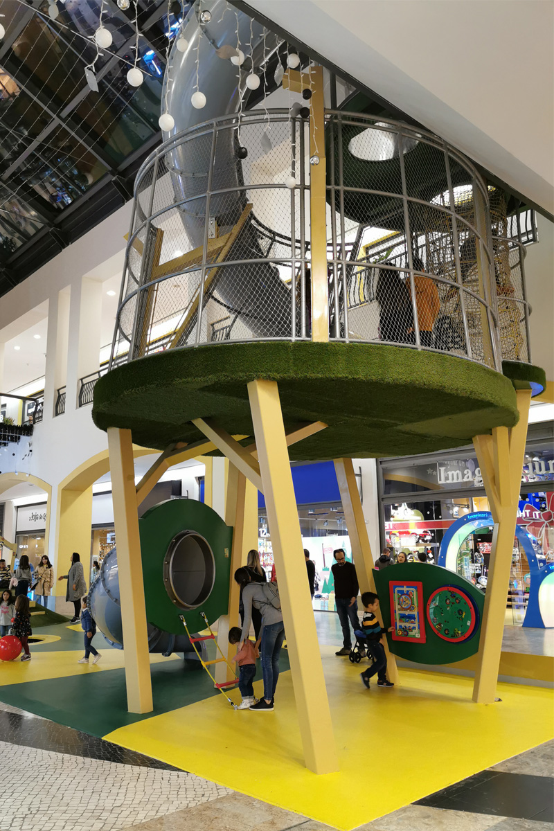 A Play Planet foi convidada a conceber e construir o novo parque infantil, dividido por 2 pisos, mas na mesma sequência visual. O espaço de intervenção compreende um espaço com cerca de 102m2 no corredor principal do Alegro Montijo, muito próximo da grande Praça Central, no piso 0, e outro espaço adjacente no Piso 1, encontrando-se este último no cruzamento entre o corredor principal e a entrada lateral Oeste do Alegro Montijo. Resultando da confluência destes dois percursos de grandes fluxos, o espaço de intervenção tem uma localização altamente privilegiada, ressaltada pela excelente iluminação natural que nele incide.