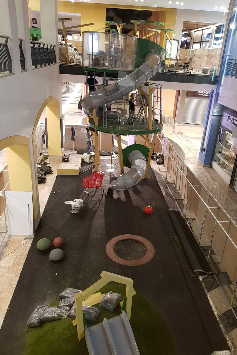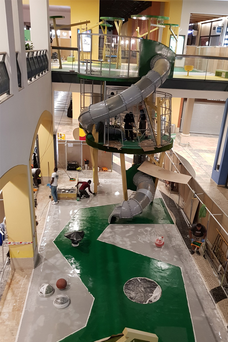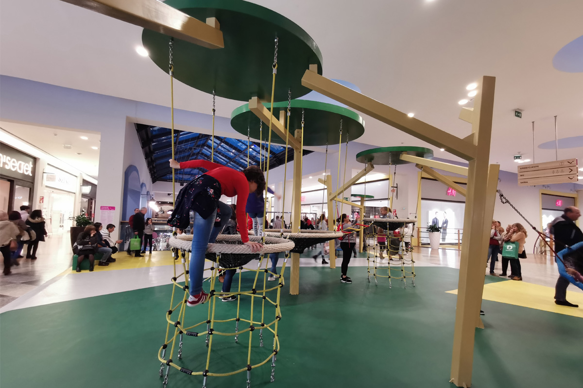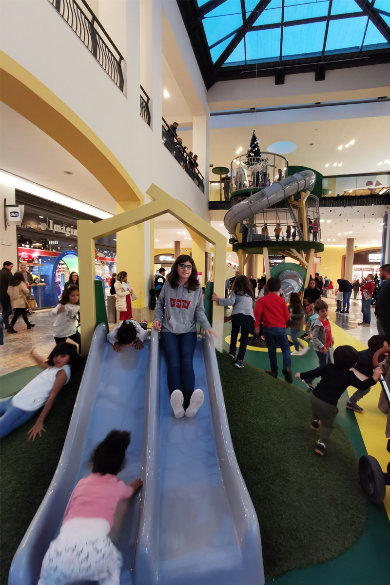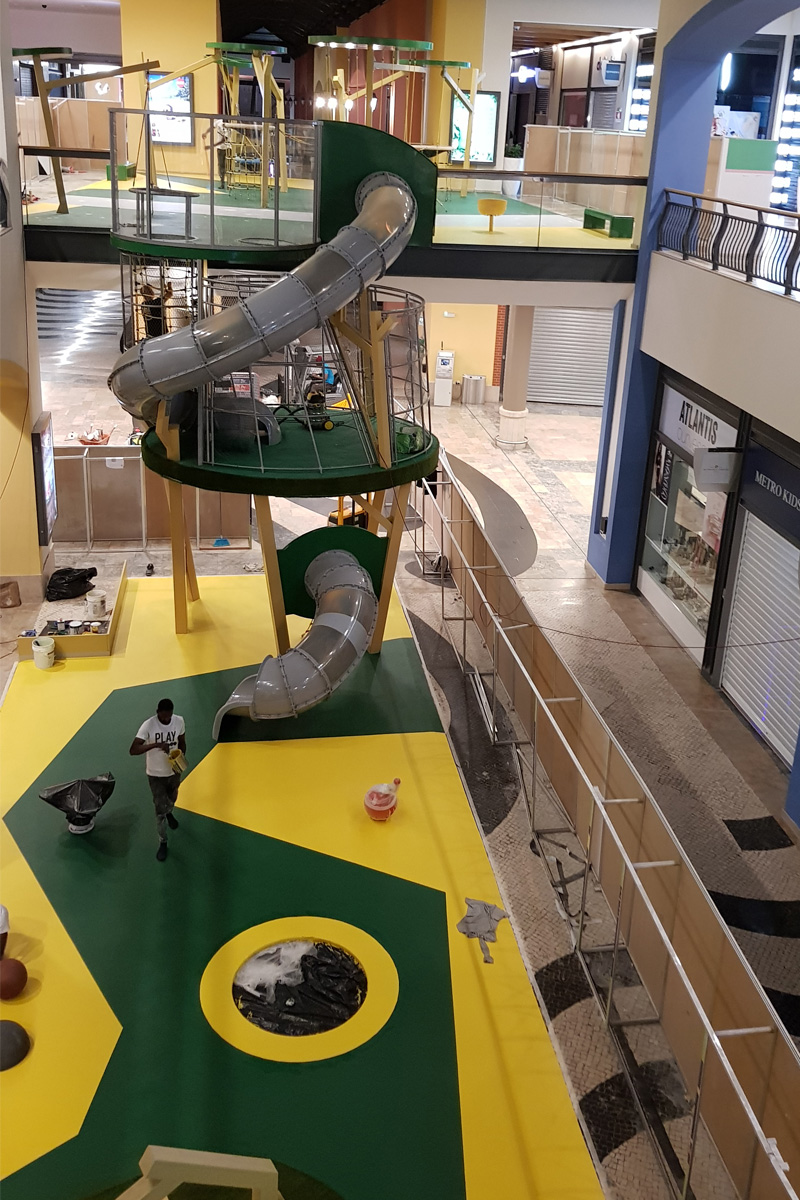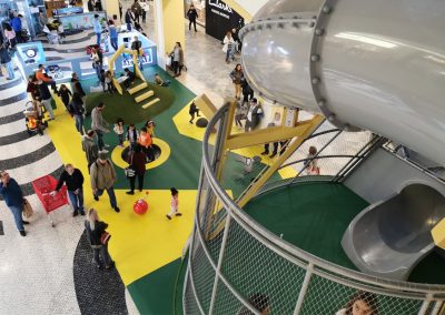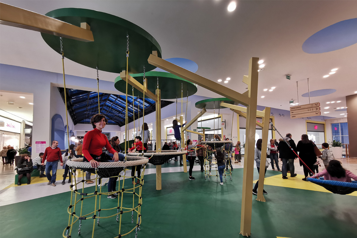 A Play Planet foi convidada a conceber e construir o novo parque infantil, dividido por 2 pisos, mas na mesma sequência visual. O espaço de intervenção compreende um espaço com cerca de 102m2 no corredor principal do Alegro Montijo, muito próximo da grande Praça Central, no piso 0, e outro espaço adjacente no Piso 1, encontrando-se este último no cruzamento entre o corredor principal e a entrada lateral Oeste do Alegro Montijo. Resultando da confluência destes dois percursos de grandes fluxos, o espaço de intervenção tem uma localização altamente privilegiada, ressaltada pela excelente iluminação natural que nele incide.