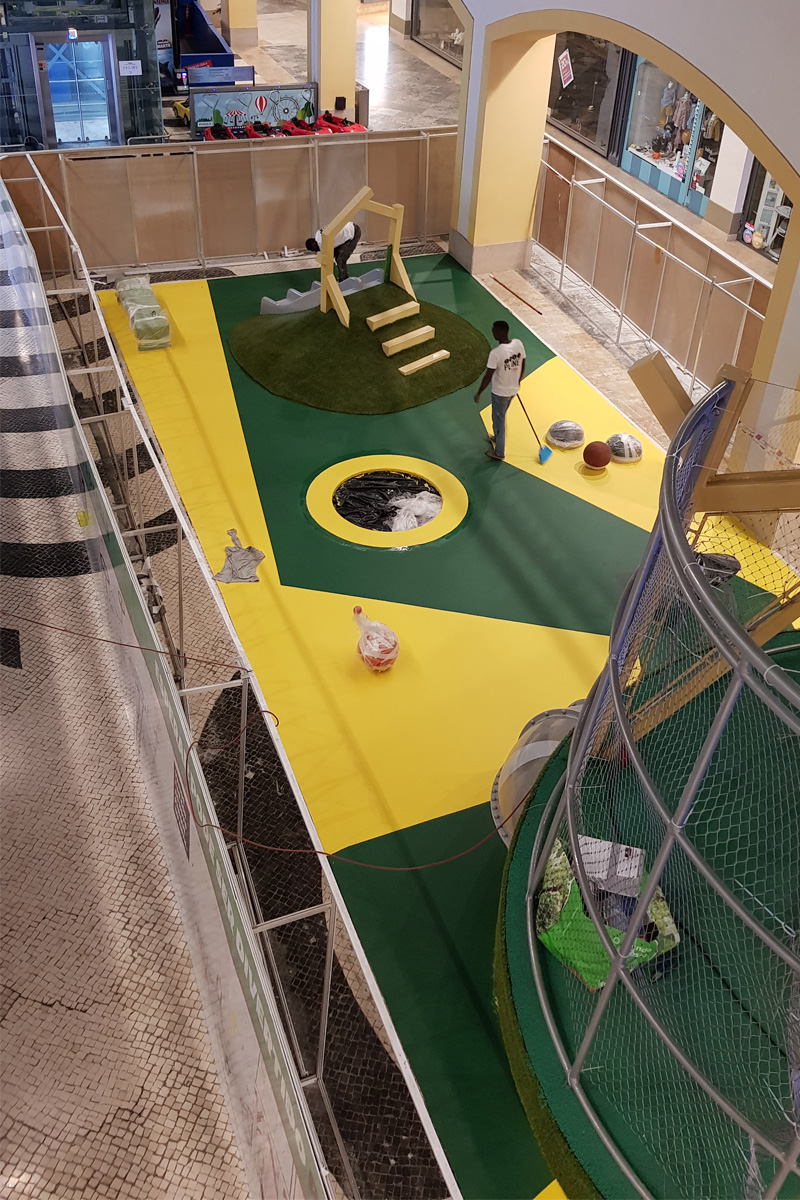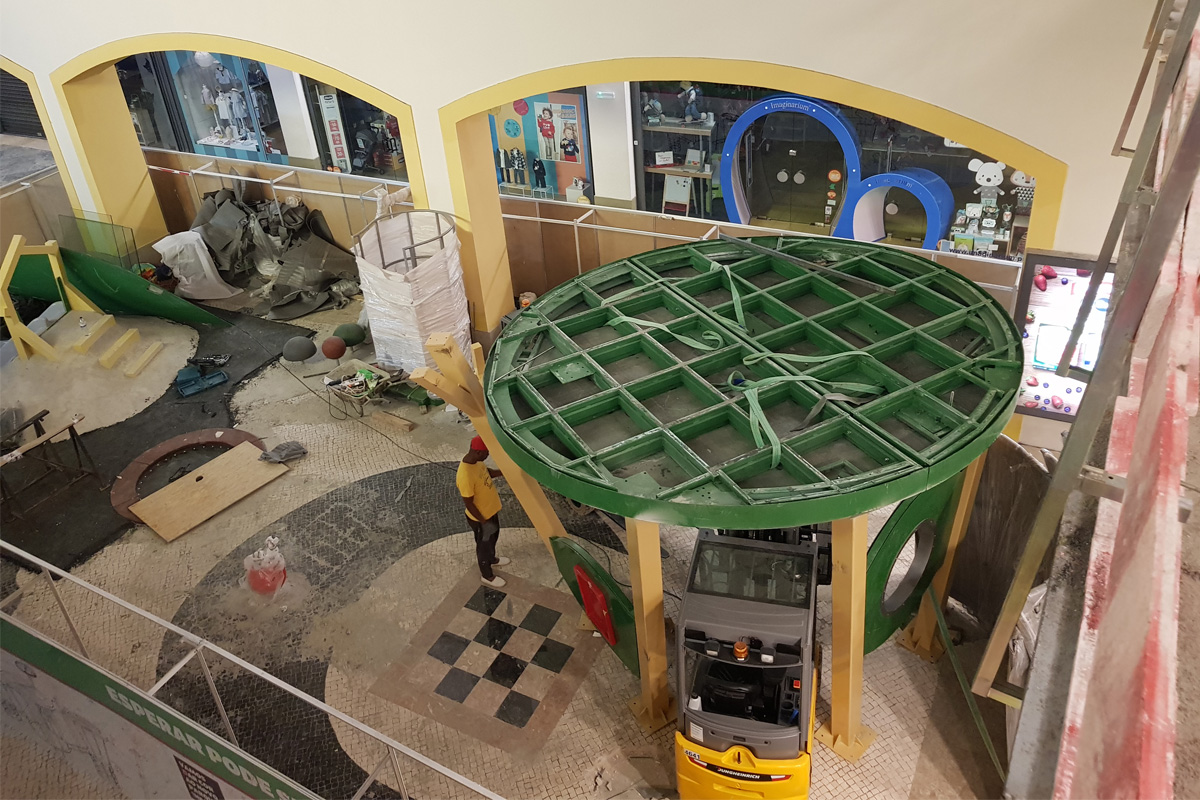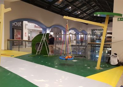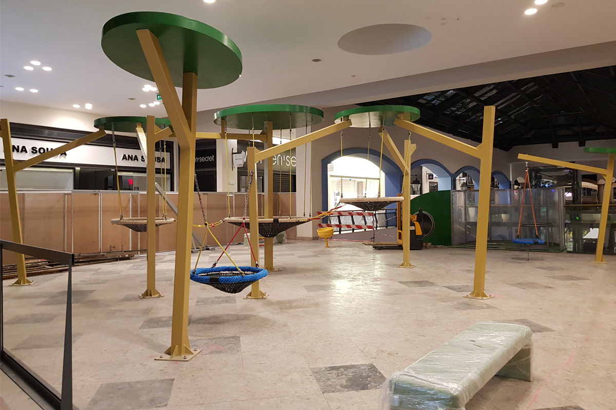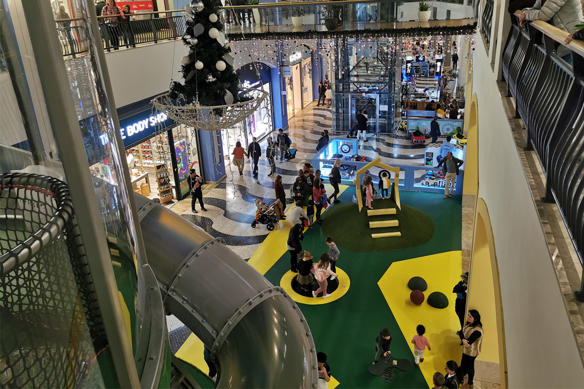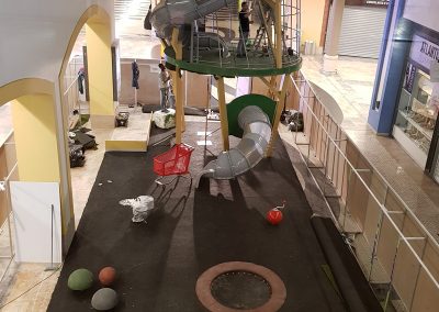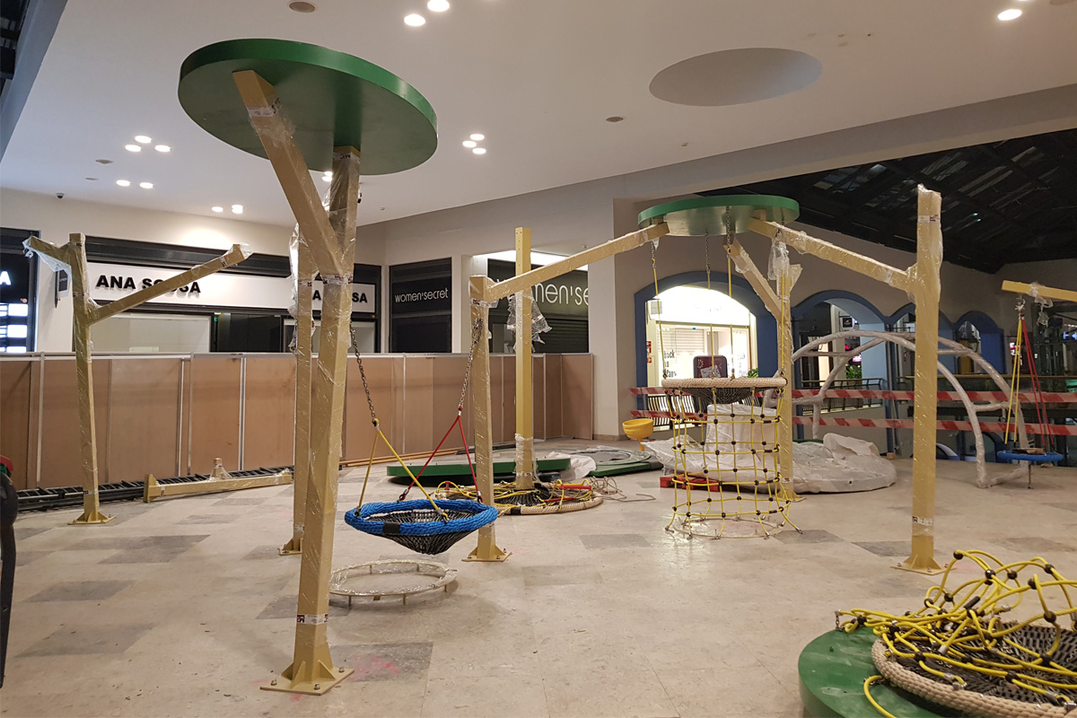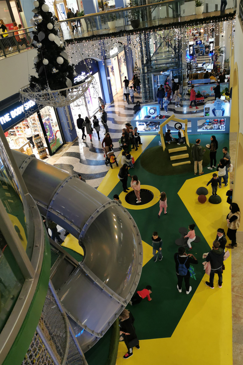A Play Planet foi convidada a conceber e construir o novo parque infantil, dividido por 2 pisos, mas na mesma sequência visual. O espaço de intervenção compreende um espaço com cerca de 102m2 no corredor principal do Alegro Montijo, muito próximo da grande Praça Central, no piso 0, e outro espaço adjacente no Piso 1, encontrando-se este último no cruzamento entre o corredor principal e a entrada lateral Oeste do Alegro Montijo. Resultando da confluência destes dois percursos de grandes fluxos, o espaço de intervenção tem uma localização altamente privilegiada, ressaltada pela excelente iluminação natural que nele incide.
