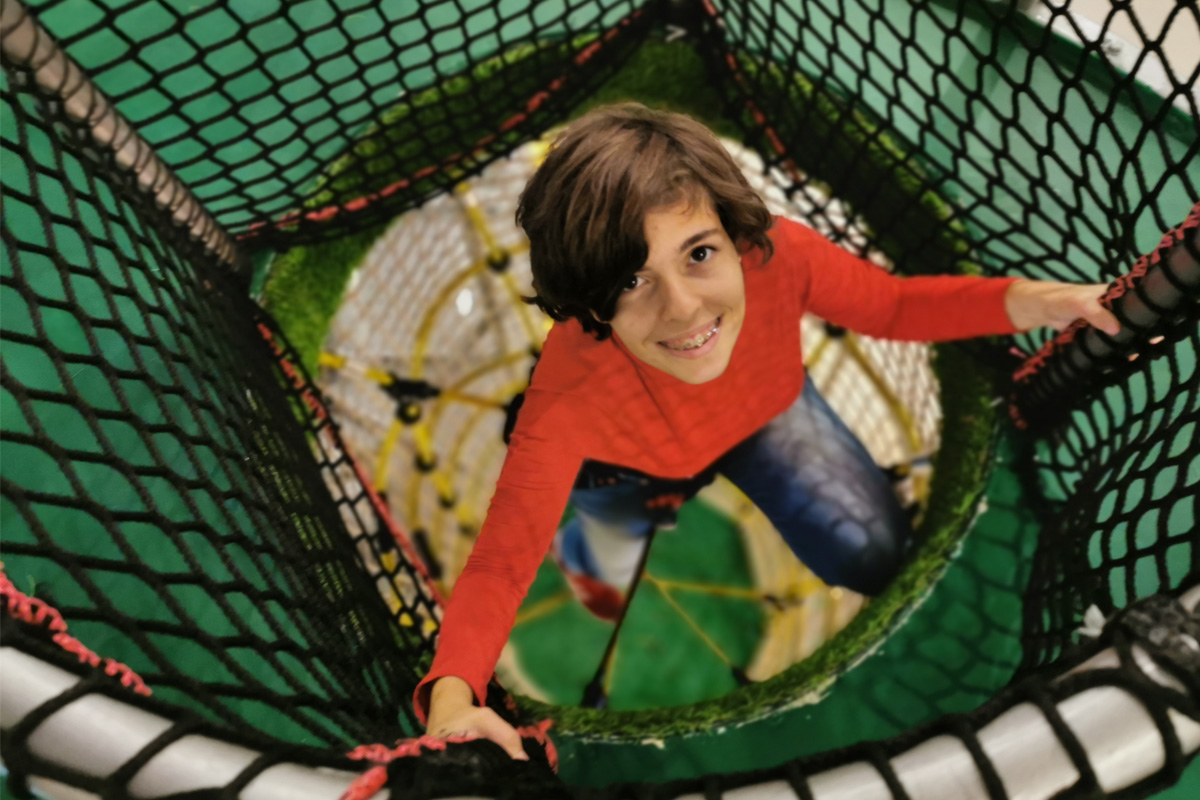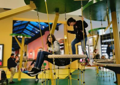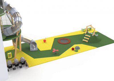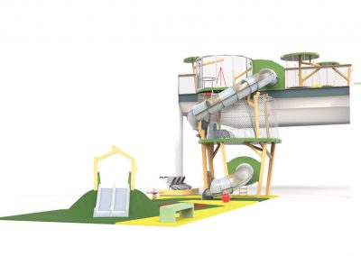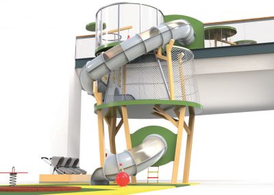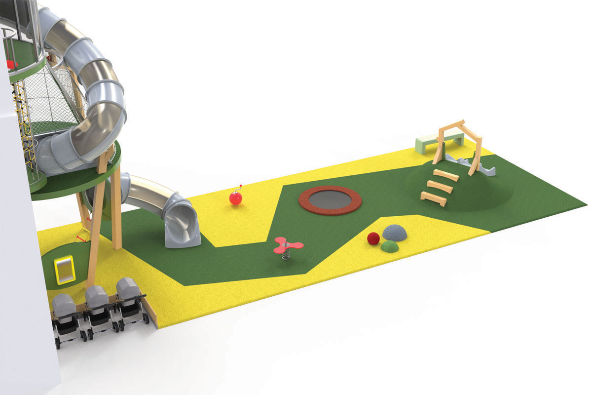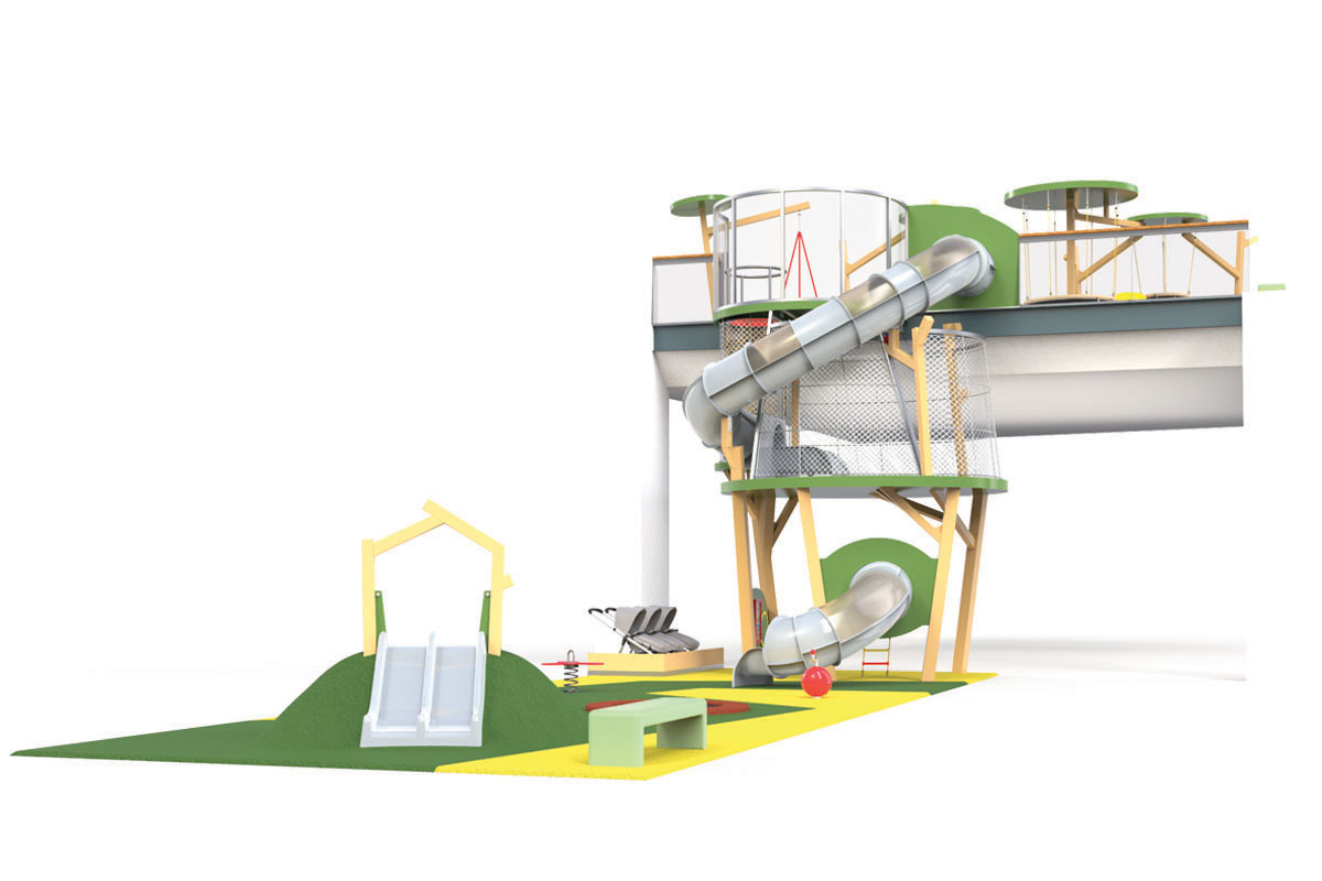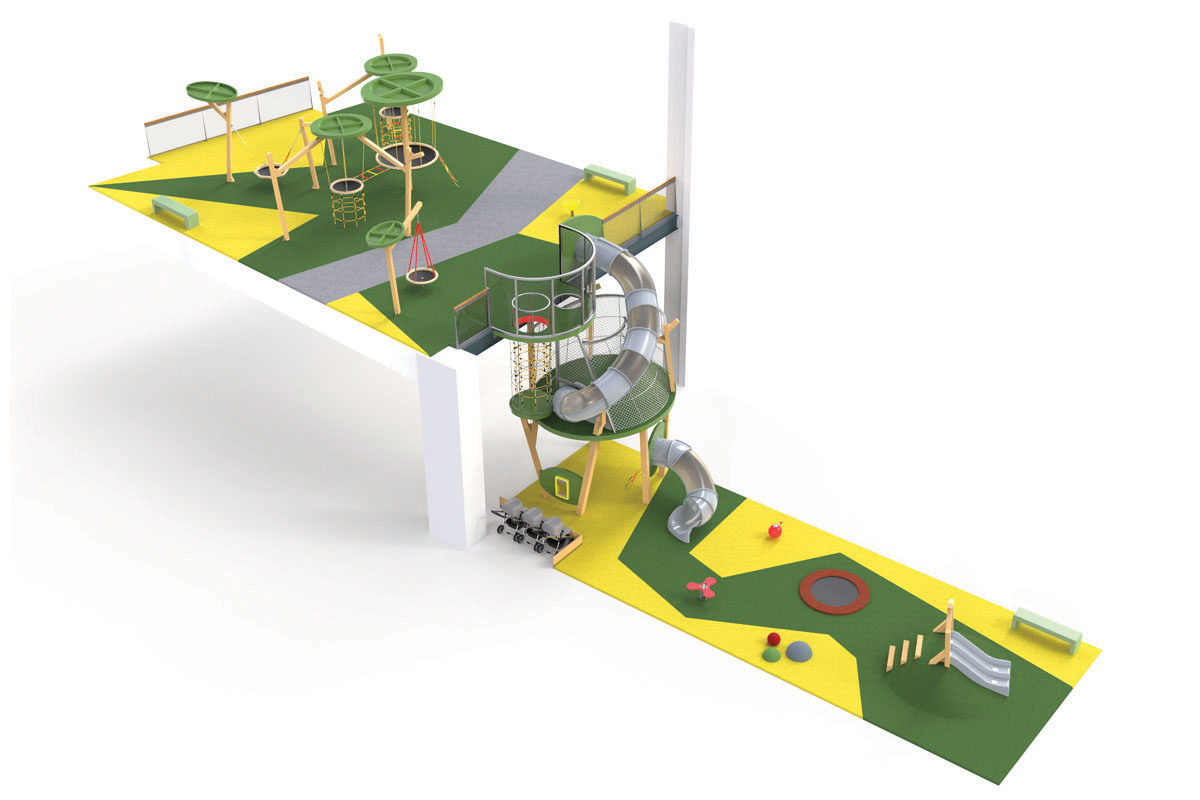 O Piso 1, muito focado no imaginário das copas das árvores, é dedicado a crianças entre 4 e 10 anos. Entre os dois pisos, aproveitando o pé direito de 6 metros, uma torre com 3 andares e um miradouro, faz a ligação do piso 1 ao piso 0, oferecendo novas oportunidades de brincadeira, aventura e desafio. Através de um escorrega que aparentemente liga os dois espaços, conseguimos ter a ilusão visual de unidade. Na realidade, estes são dois escorregas distintos, pertencentes ao espaço do Piso 0 e ao do Piso 1, com uma lógica de funcionamento independente, garantindo assim todas as questões de conforto e vigilância dos acompanhantes.