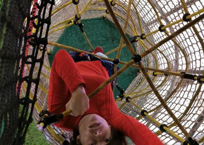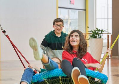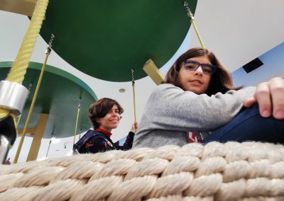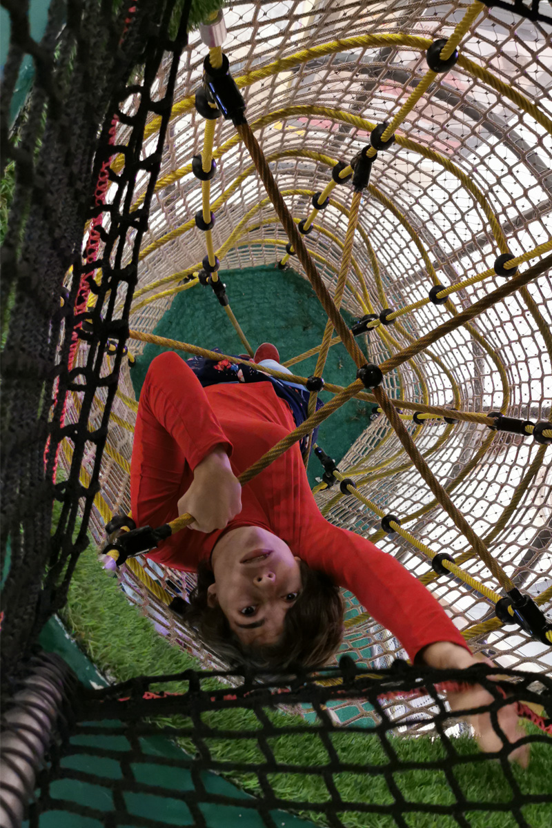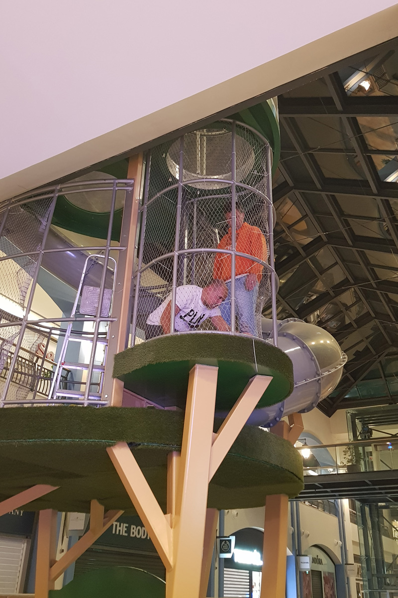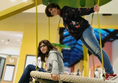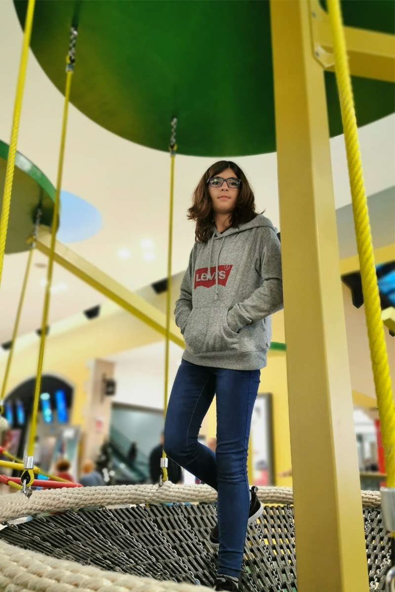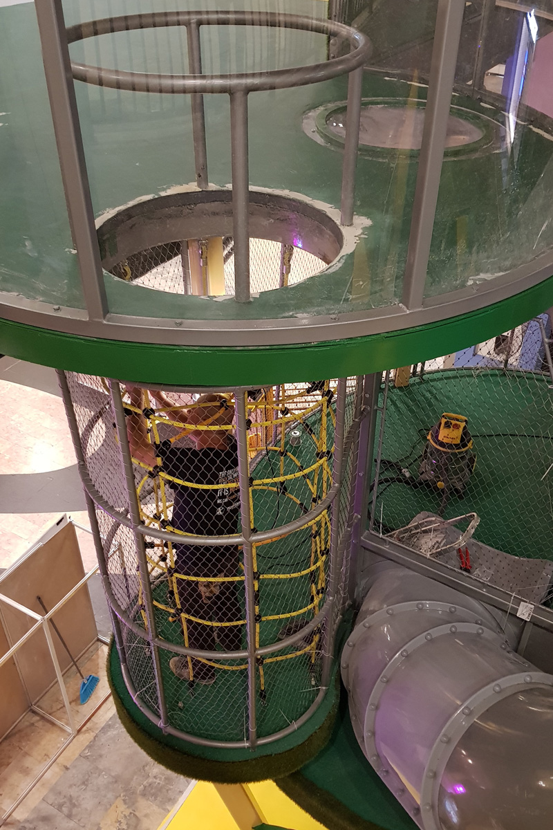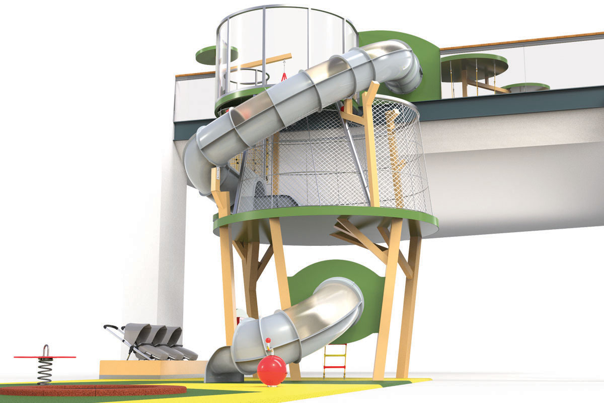 O Piso 1, muito focado no imaginário das copas das árvores, é dedicado a crianças entre 4 e 10 anos. Entre os dois pisos, aproveitando o pé direito de 6 metros, uma torre com 3 andares e um miradouro, faz a ligação do piso 1 ao piso 0, oferecendo novas oportunidades de brincadeira, aventura e desafio. Através de um escorrega que aparentemente liga os dois espaços, conseguimos ter a ilusão visual de unidade. Na realidade, estes são dois escorregas distintos, pertencentes ao espaço do Piso 0 e ao do Piso 1, com uma lógica de funcionamento independente, garantindo assim todas as questões de conforto e vigilância dos acompanhantes.