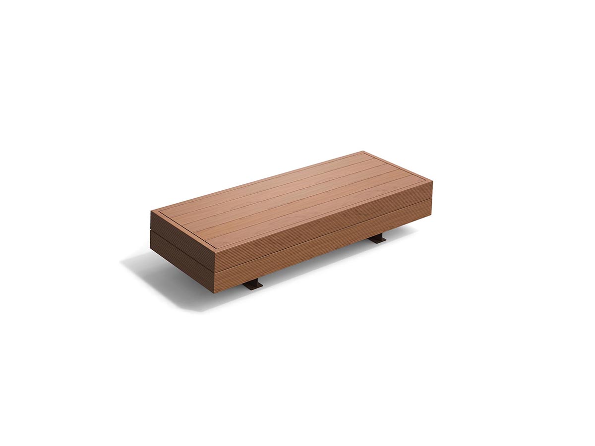 Assento modular retangular, sem encosto, composto por uma estrutura perimetral dupla e um, assento, ambos em madeira, apoiados em pés metálicos. Os assentos podem ser instalados individualmente ou em composição, compondo diversas formas geométricas.