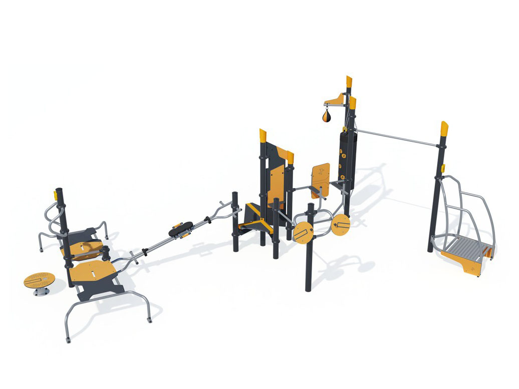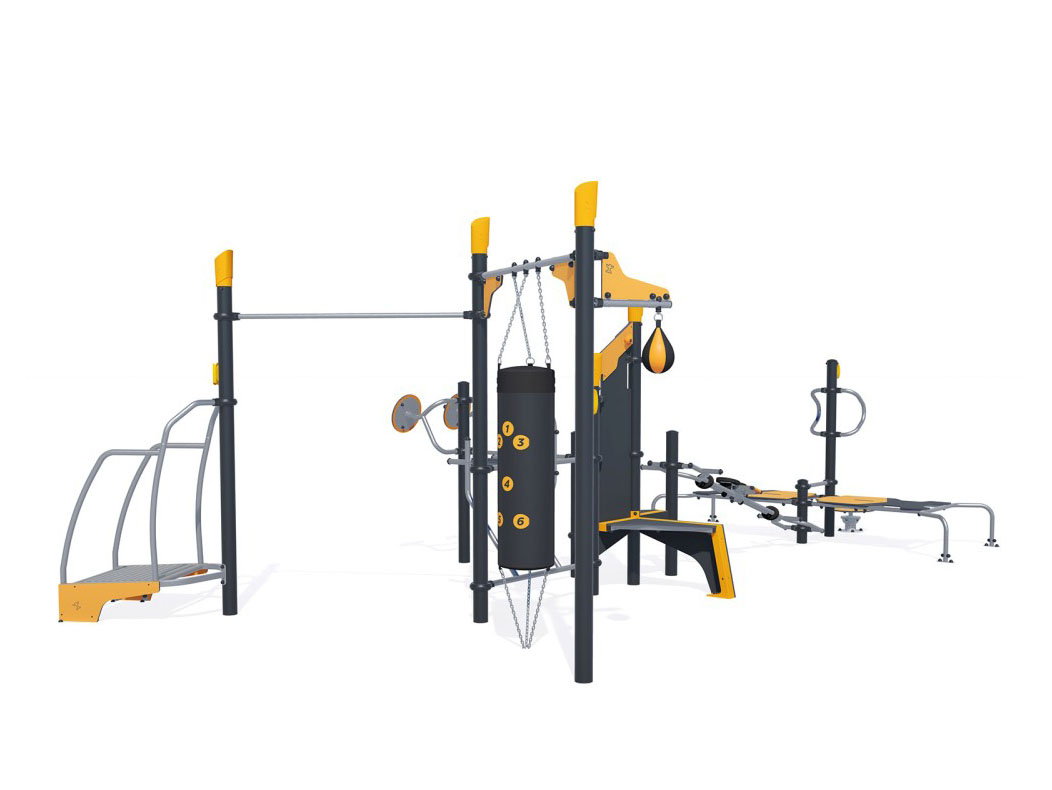 Estação lúdica e desportiva, composta por uma prancha de equilíbrio com pegas metálicas para apoio de mãos, duas pranchas horizontais, dispostas frente a frente, com barra metálica de apoio para abdominais e flexões, uma máquina de remo dual, um módulo pequeno com assento, um Totem com cabide para dependurar casacos e banco, uma barra horizontal com 125cm, um conjunto de rodas de Tai-Chi, duas barras com apoios de braços e costas para fundos e abdominais, um saco de boxe, uma bola de boxe, uma barra fixa e uma plataforma de corrida com apoios para as mãos. Ideal para a prática desportiva e para socializar.