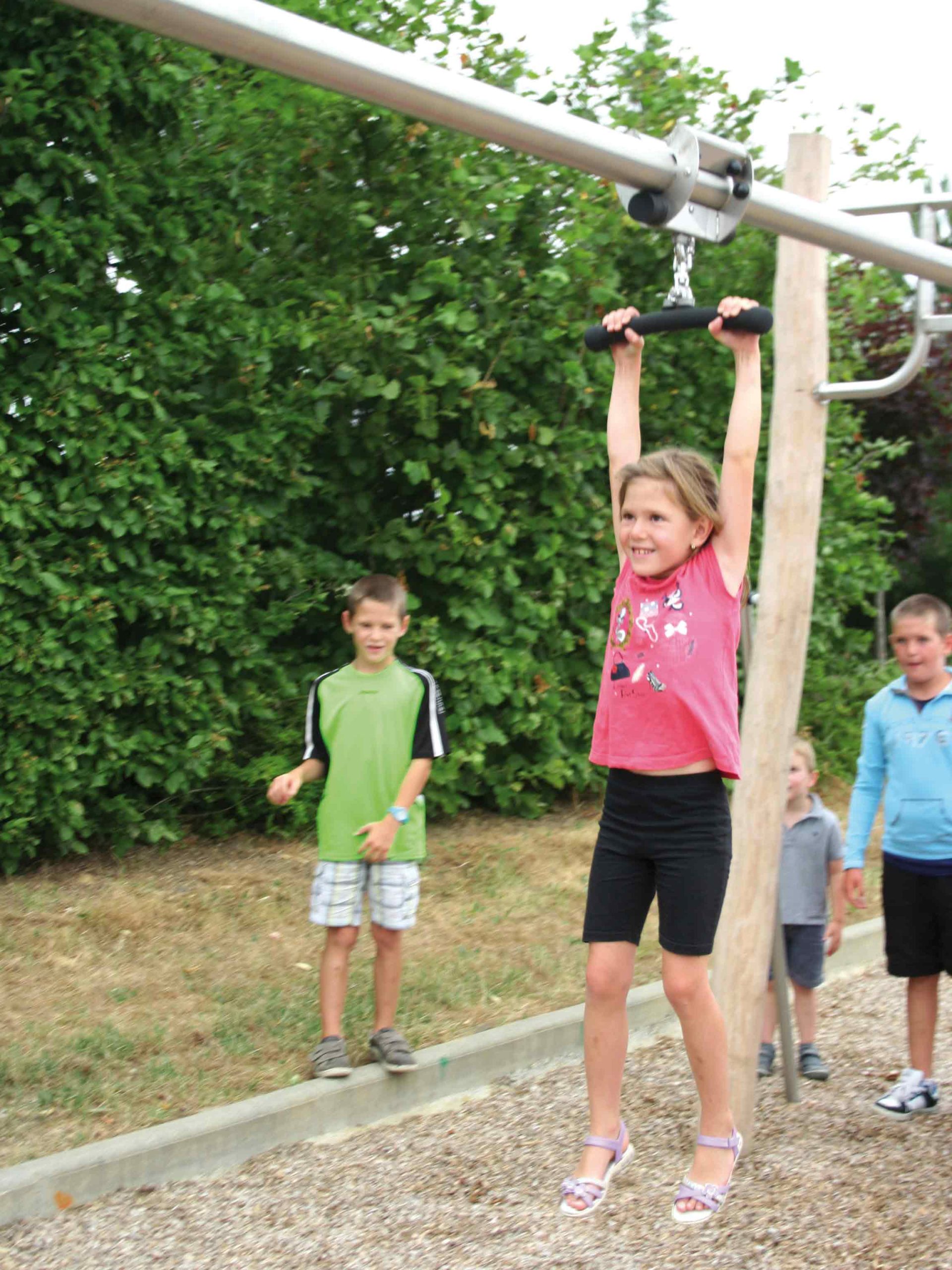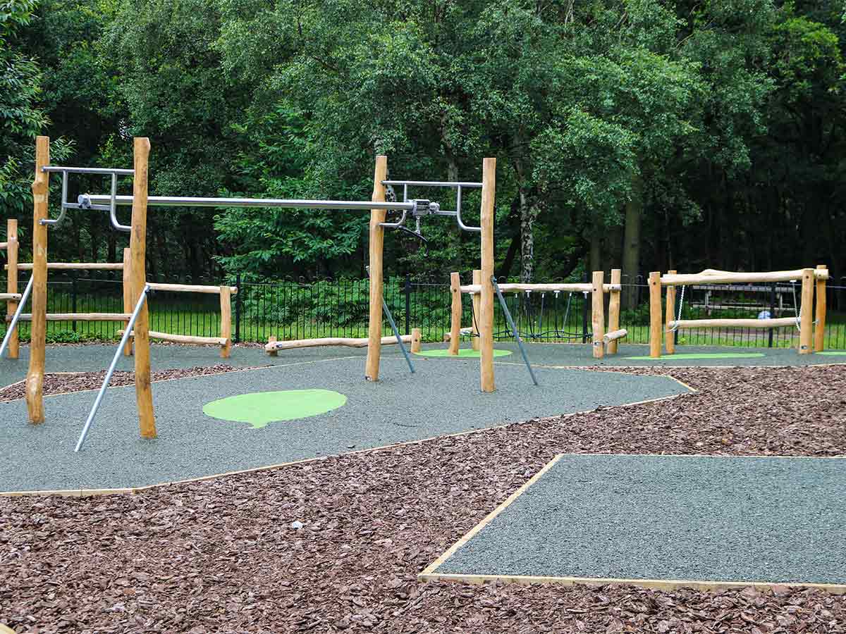 Materiais: Os diferentes postes (60 a 80mm/ 100 a 120mm/120 a 140mm de diâmetro) são feitos de robínia sem seiva e sem casca. A madeira de robínia é lixada e como é naturalmente à prova de podridão não requer nenhuma proteção química adicional. É igualmente extremamente resistente a ataques de fontes externas (insetos, fungos, variações climáticas), garantindo a durabilidade a longo prazo ao equipamento. Os tubos são fabricados em aço inoxidável, diâmetro 40mm, garantindo durabilidade e confiabilidade duradouras ao equipamento. Fixações de aço inoxidável protegidas por tampas antivandalismo em poliamida.