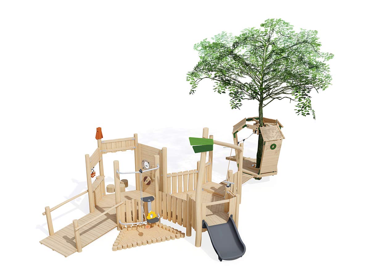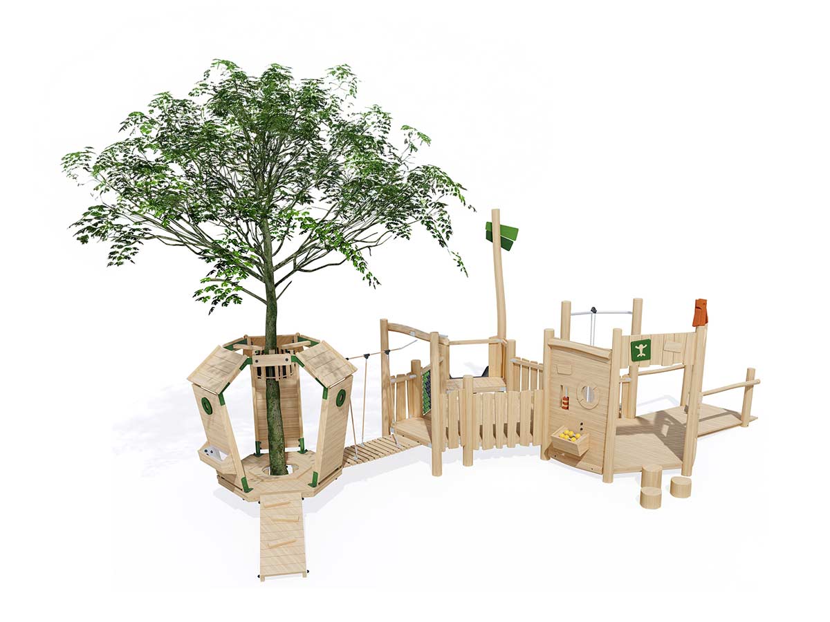 A peça mais emblemática desta estrutura é composta por uma cabana hexagonal em madeira de abeto Douglas, apoiada numa plataforma em torno do tronco. Esta cabana apresenta três lados fechados e três abertos, equipada com uma floreira, concebida para conter terra e plantas, permitindo às crianças aprender jardinagem, observar raízes, insetos e ciclos naturais através de um painel acrílico transparente no interior da cabana, transformando o equipamento num laboratório vivo de exploração. Este contacto direto com a terra e com o crescimento das plantas estimula os sentidos — pelo tato, pelas cores e aromas — e desperta a curiosidade científica das crianças, reforçando a educação para a sustentabilidade. A cabana assenta sobre uma plataforma fixada por um sistema patenteado de cintas e cunhas em Robinia, que distribui uniformemente a carga e preserva o crescimento natural da árvore. Este sistema, certificado pela patente FR2503637, utiliza cunhas em contacto total com o tronco, fixas com pregos em aço inox desinfetados, que permitem à árvore cicatrizar naturalmente. O aro metálico e os painéis de fecho asseguram robustez, segurança e durabilidade, sem necessidade de cortes ou agressões ao tronco. O acesso à cabana é feito por uma rampa de escalada, com apoios para trepar, estimulando a coordenação e o equilíbrio. O percurso lúdico deste equipamento integra ainda: Duas plataformas hexagonais, ligadas à cabana por uma ponte de equilíbrio, em madeira, com corrimãos laterais em corda; Uma rampa de acesso, adequada a cadeira de rodas, com corrimãos em madeira, que assegura acessibilidade para crianças com mobilidade reduzida; 3 troncos de equilíbrio tipo degraus japoneses; 1 escorrega largo, em plástico, com 0,60m de altura, que facilita o acesso a crianças com mobilidade reduzida que desejam desfrutar das sensações de deslizar e escorregar; 1 varandim com contas de duas cores, permitindo compor diferentes formas e objectos rodando as contas; 1 telescópio para exploração imaginária; 1 fachada de mercado com um cesto com esferas de ábaco, uma janela com peças de madeira para manusear, uma roda para girar e uma janela circular para espreitar; 1 pórtico de entrada de mercado com elementos decorativos , que incentivam as crianças a desenvolver a sua imaginação; 1 fachada de mercado, com balcão tipo loja, com elementos em madeira suspensos e um carril curvo com peças para manusear; e uma caixa de areia, de fácil acesso, com 1 grua com balde, 1 gotejador para brincar com areia e bordas feitas de troncos, reduzindo a quantidade de areia necessária para esta área. A areia estimula os sentidos tátil e visual, enquanto proporciona um espaço para incentivar as crianças a brincarem com outras crianças e darem asas à sua criatividade. Este equipamento foi concebido para ser inclusivo, oferecendo atividades acessíveis ao nível do solo e por rampa, para crianças em cadeira de rodas ou com mobilidade reduzida. Estes elementos estimulam os sentidos através de recursos táteis, visuais e sonoros, favorecendo o role play e a socialização. Componentes móveis como discos, contas de ábaco e elementos rotativos promovem a motricidade fina, a coordenação e as competências cognitivas. No total, o equipamento integra 21 valências de jogo, equilibrando estímulos motores, cognitivos e sensoriais, e fomentando a interação entre todas as crianças. Este enfoque inclusivo reforça a missão da gama Arborea Play® de promover não apenas a ligação à natureza, mas também a equidade no acesso ao brincar, transformando a brincadeira em experiência partilhada e educativa.