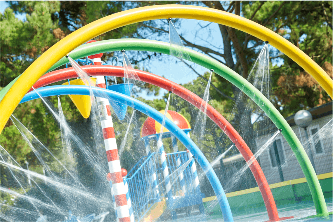 Equipamento aquático para spray park ou para colocar em piscinas de crianças até uma profundidade de 500mm. Com a forma de 1 arco colorido, do qual saem diversos jatos de água. Equipamento fabricado na Europa, de acordo com as Normas Europeias EN 1069, 1176, 13451 e 17232, certificado pela TUV.