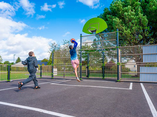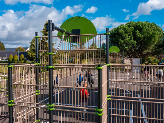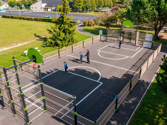 Arena multidesportiva inclusiva, com acesso a utilizadores em cadeiras de rodas pelas laterais das balizas. Composta por 30 postes de aço e painéis de alumínio, 2 balizas e 2 tabelas de basket. Extremamente resistente e com design especial antirruído.