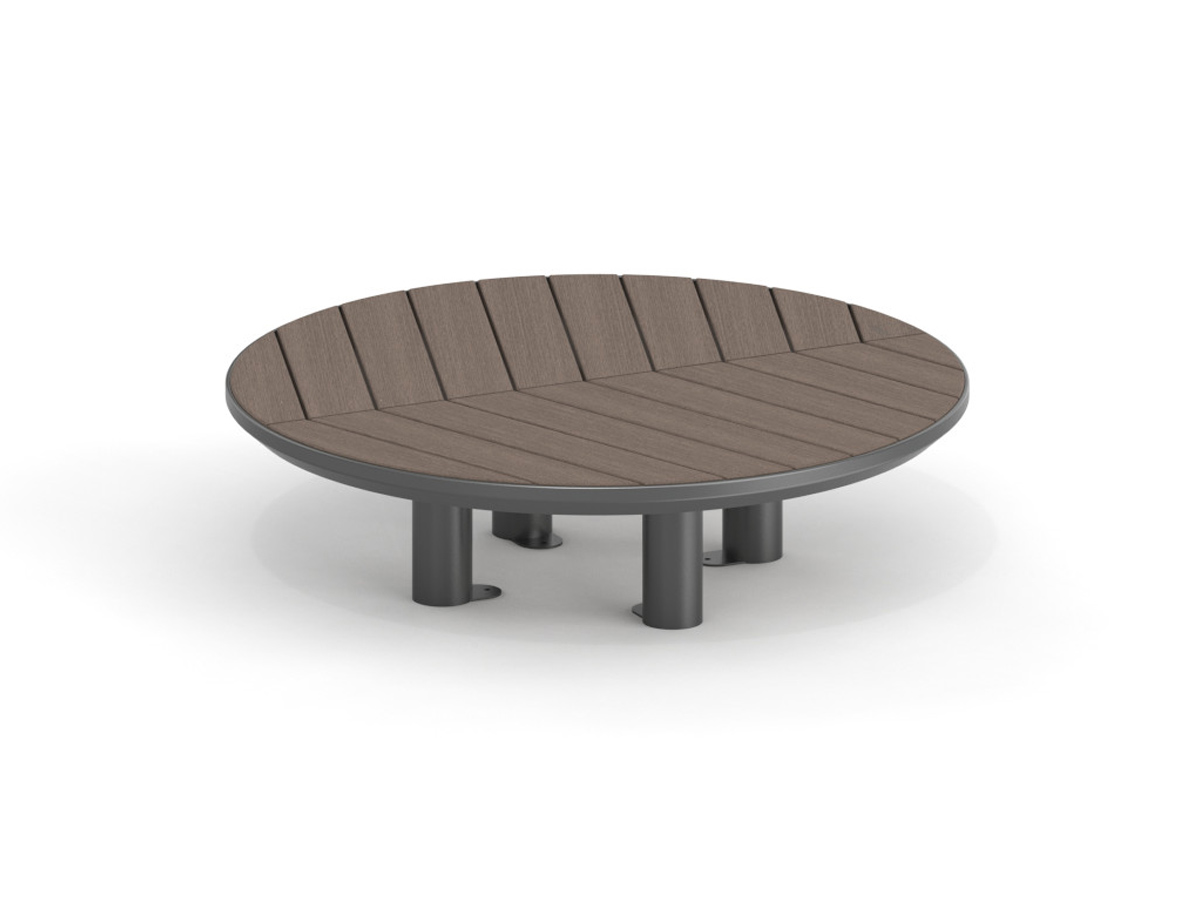 Assento circular composto por uma estrutura e suportes de aço, uma estrutura perimetral de alumínio e um assento plano em WPC (Compósito Polimérico de Madeira), com travessas dispostas num padrão de espiga.