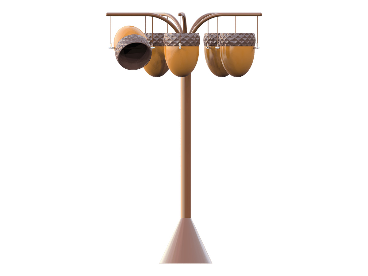 Baldes de descarga para spray park ou para colocar em piscina de criança com profundidade máxima de 500mm. Composto por um poste com baldes de descarga no topo em forma de bolotas. Equipamento fabricado na Europa, de acordo com as Normas Europeias EN 1069, 1176, 13451 e 17232, certificado pela TUV.