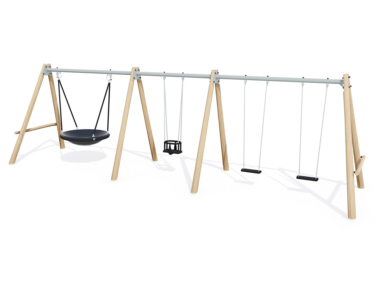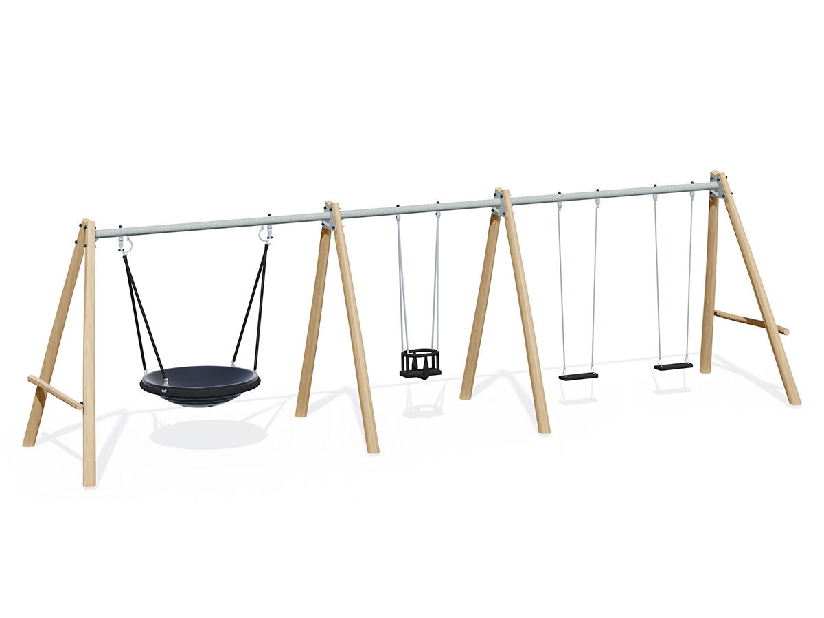 Materiais: Os diferentes postes (com diâmetro médio de 60 a 80 mm / 120 a 140 mm) são feitos de robínia sem seiva e sem casca. A madeira de robínia é lixada e como é naturalmente à prova de podridão não requer nenhuma proteção química adicional. É igualmente extremamente resistente a ataques de fontes externas (insetos, fungos, variações climáticas), garantindo a durabilidade a longo prazo do equipamento. A viga horizontal é feita de aço galvanizado não pintado. O assento ninho de pássaro é feito de uma única peça de polietileno rotomoldado 30% reciclado. Está fixo a uma estrutura de aço inoxidável equipada com amortecedores. O assento é suspenso por cordas de aço galvanizado cobertas por PVC. Anéis deslizantes de PVC são instalados para limitar o desgaste das peças metálicas ao longo do tempo. Os anéis têm acesso por uma manilha de aço inoxidável à prova de vandalismo. As correntes são feitas de aço galvanizado. O mecanismo de rotação de articulação dupla é fabricado em aço inoxidável. Uma corrente de segurança fornece suporte adicional para o assento. Os assentos são feitos de borracha moldada com absorção de choque. O assento de cadeira de bebé é feito de poliuretano para maior conforto. Correntes de aço inoxidável. Os suportes de fixação do assento são feitos de cabo de aço inoxidável de 10 mm. Fixações de aço inoxidável ou banhado, protegidas por tampas antivandalismo em poliamida.