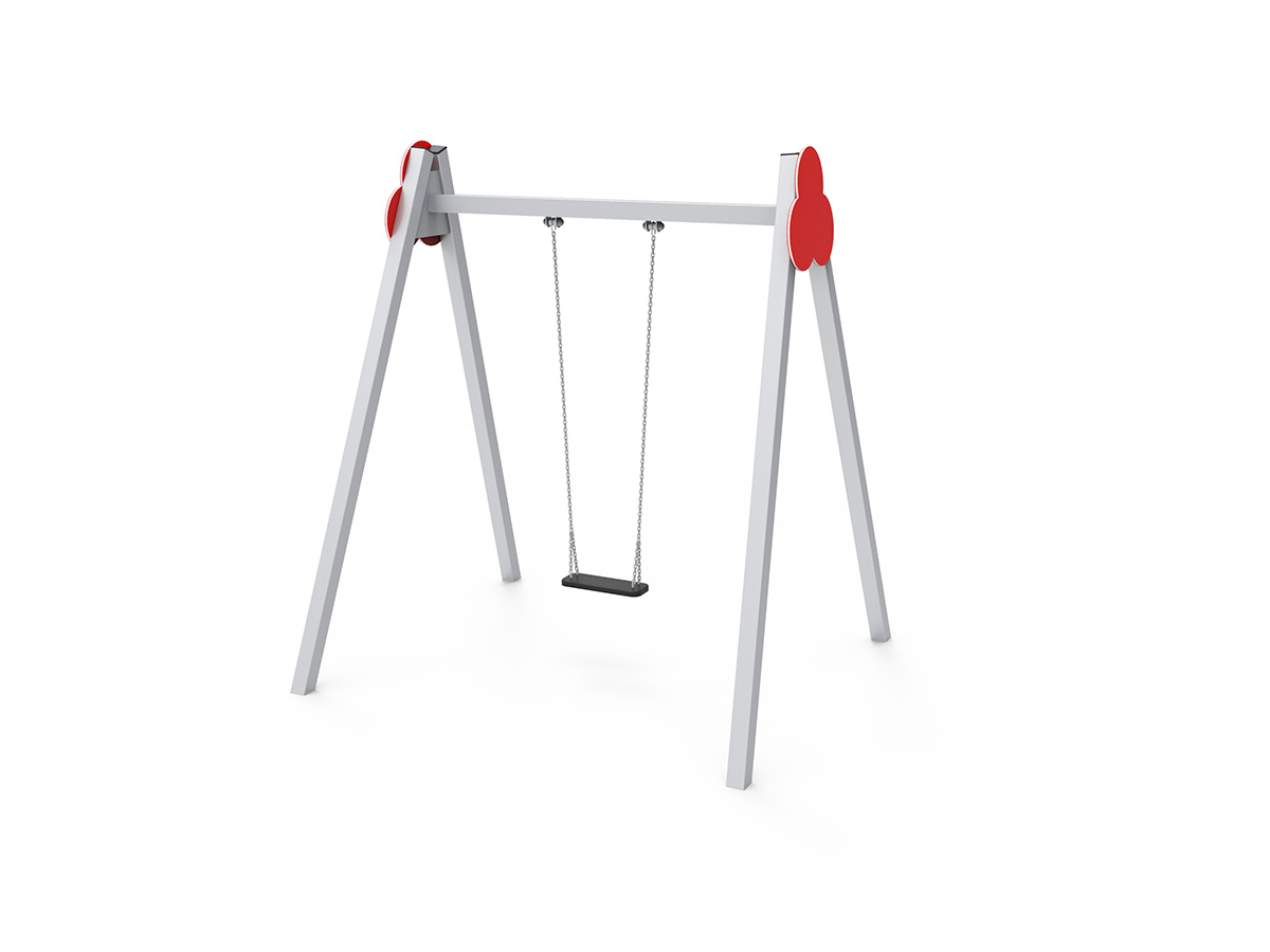 Baloiço individual composto por pórtico metálico com quatro postes inclinados em forma de “A”, uma trave horizontal em aço galvanizado e duas proteções laterais coloridas no topo da estrutura. Inclui um assento ideal para crianças com controlo postural desenvolvido, proporcionando uma experiência de balanço estável e segura. Este equipamento promove o desenvolvimento do equilíbrio, da coordenação e da perceção corporal, estimulando os sistemas vestibular e proprioceptivo. A sua configuração individual é adequada para espaços de menor dimensão ou para complementar zonas de recreio com outros equipamentos mais complexos. Equipamento certificado segundo a norma europeia EN 1176 e conforme a legislação nacional relativa à segurança em espaços de jogo e recreio. Para instalação com fixação direta em fundações de betão com 0,60 m de profundidade.