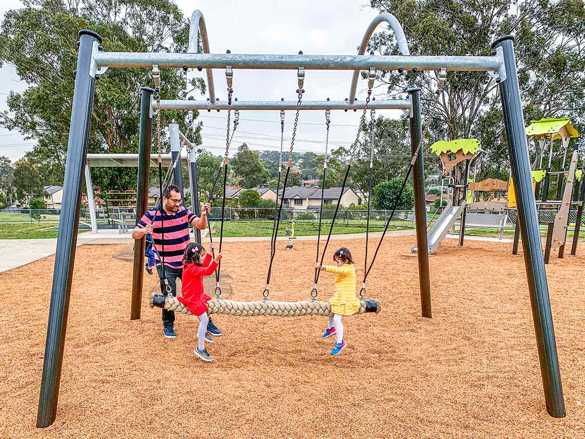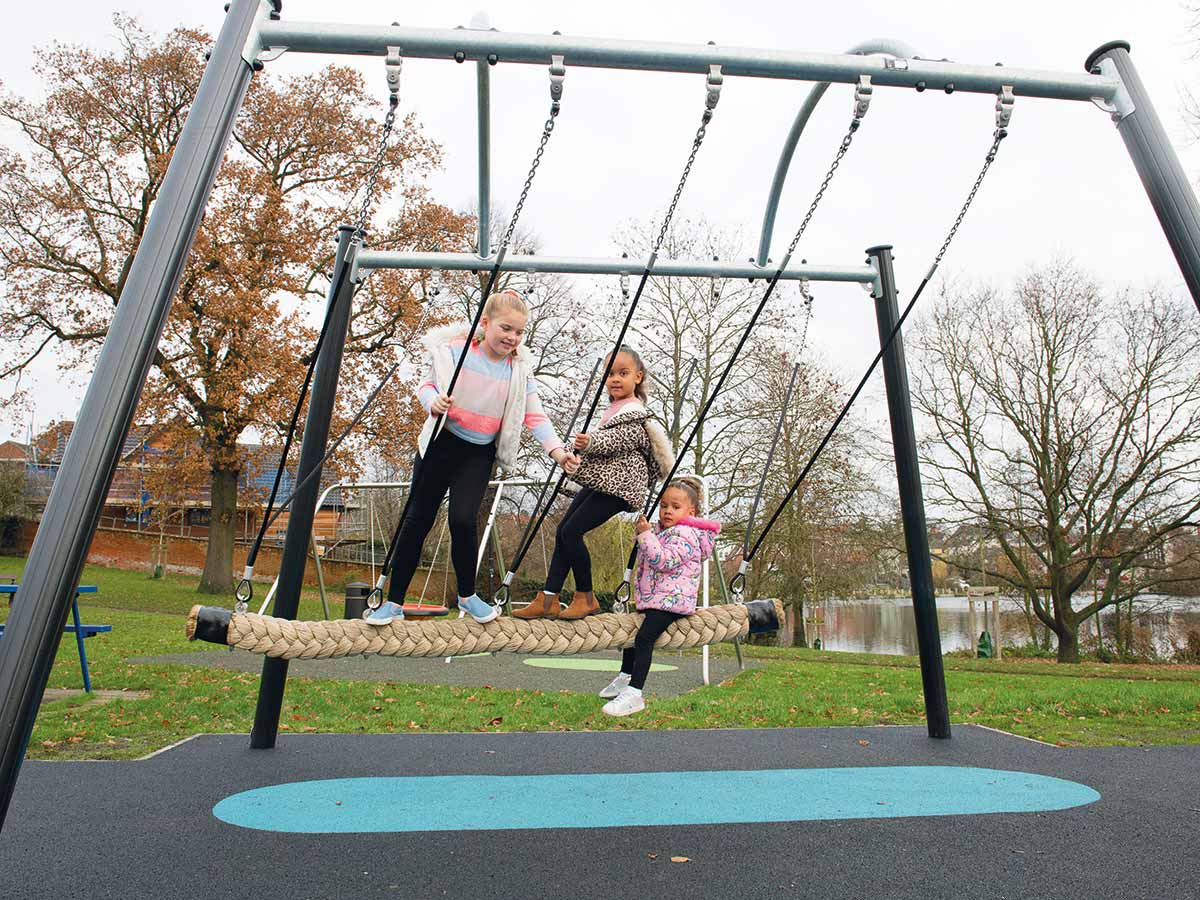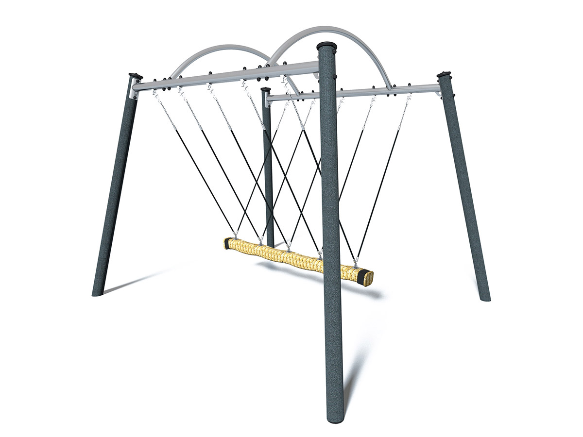 Materiais: Os postes de 125 mm de diâmetro são feitos de aço galvanizado lacado, garantindo robustez e durabilidade. As suas capas são feitas de poliamida moldada por injeção. O assento é feito de corda de polipropileno, fixo a elementos de ligação em aço inoxidável, suspenso por cordas de aço galvanizado cobertas por poliéster, e com extensão superior através de uma corrente em aço galvanizado. A viga horizontal é fabricada em aço galvanizado, não pintado. Os tubos são feitos de aço com 60 mm de diâmetro. Os rolamentos são feitos de aço inoxidável. Fixações de aço inoxidável, protegidas por tampas antivandalismo em poliamida.