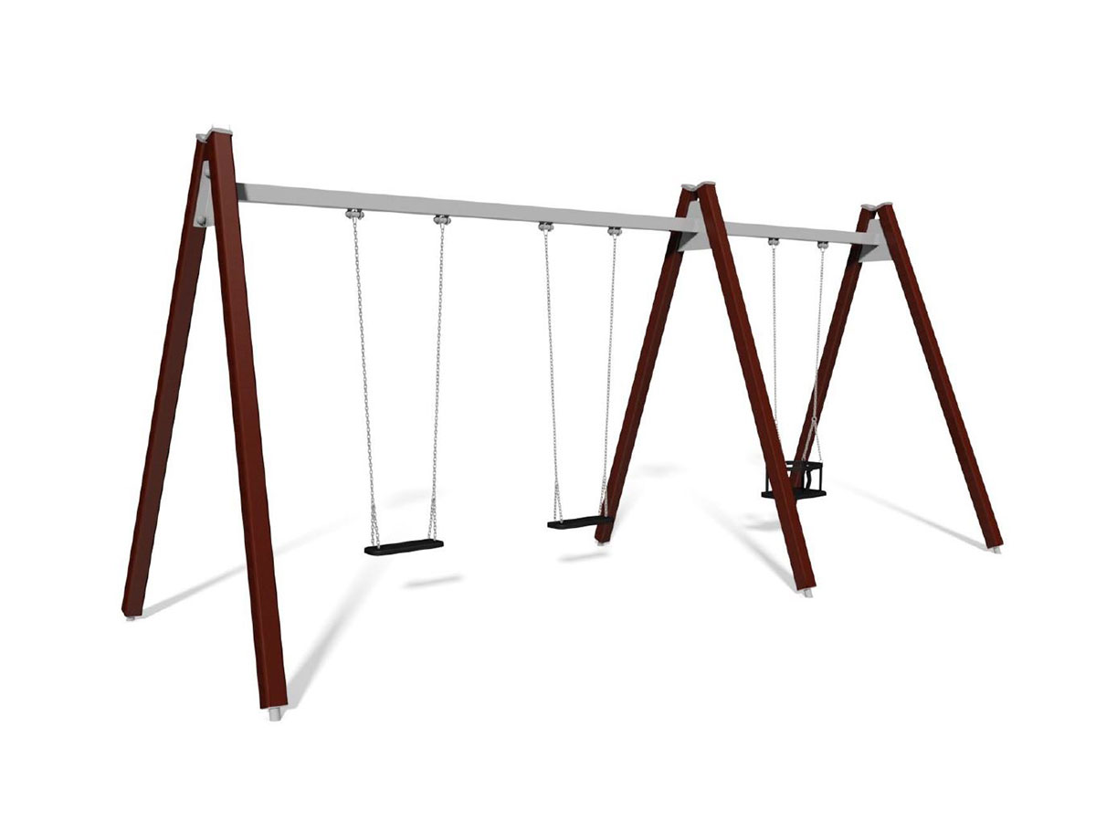 Baloiço multifuncional para três utilizadores, concebido para integrar diferentes idades e capacidades no mesmo equipamento. Estrutura composta por pórtico com seis postes inclinados em madeira tratada e duas traves metálicas superiores, com seis pontos de suspensão. Inclui dois assentos planos com correntes e um assento tipo cadeirinha para bebés, permitindo a utilização simultânea por crianças mais velhas e por crianças pequenas, com total segurança. A combinação de assentos promove a socialização intergeracional e o jogo paralelo, enquanto estimula o desenvolvimento da perceção espacial, coordenação motora e equilíbrio. Equipamento certificado segundo a norma europeia EN 1176 e em conformidade com a legislação nacional em vigor. Sistema de fixação por fundações em betão com 0,60 m de profundidade. Todos os postes com âncoras metálicas, evitando o contacto direto com o solo e prolongando a durabilidade da estrutura.