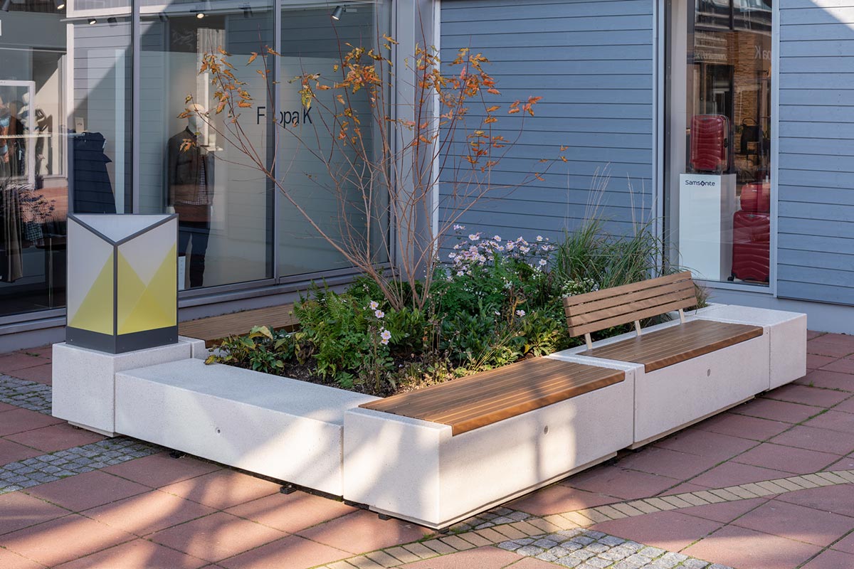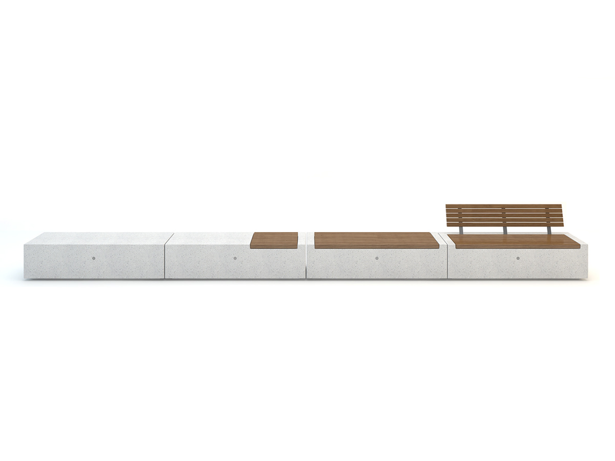 Banco modular monolítico, com formato retangular, em granito reconstituído, cor à escolha (Granito branco ou Granito cinza), com acabamento a jato de areia nas laterais, bordas superiores escovadas, com verniz anti degradação e um assento de grupo em madeira de conífera. Pode ser usado como elemento isolado ou em combinações criativas, com outros bancos e floreiras da coleção “Demetra”.