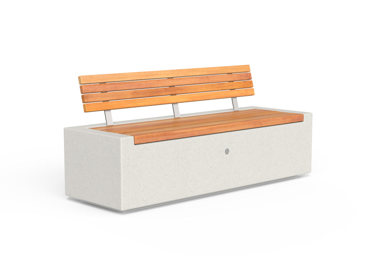 Banco modular monolítico, com formato retangular, em granito reconstituído, cor à escolha (Granito branco ou Granito cinza), com acabamento a jato de areia nas laterais, bordas superiores escovadas, com verniz anti degradação, com encosto e assento de grupo em madeira de conífera. Pode ser usado como elemento isolado ou em combinações criativas, com outros bancos e floreiras da coleção “Demetra”.