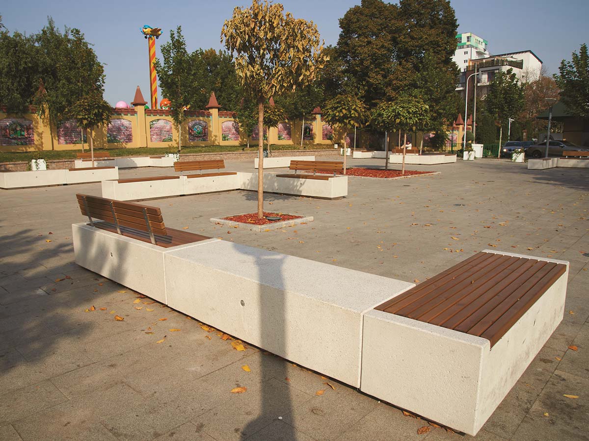 Materiais: Granito reconstituído usando uma base de cimento Portland e agregados fluviais de vários tamanhos. Assento de grupo e encosto em madeira de coníferas (Pinho, Abeto ou similar), com um acabamento pigmentado à base de água.