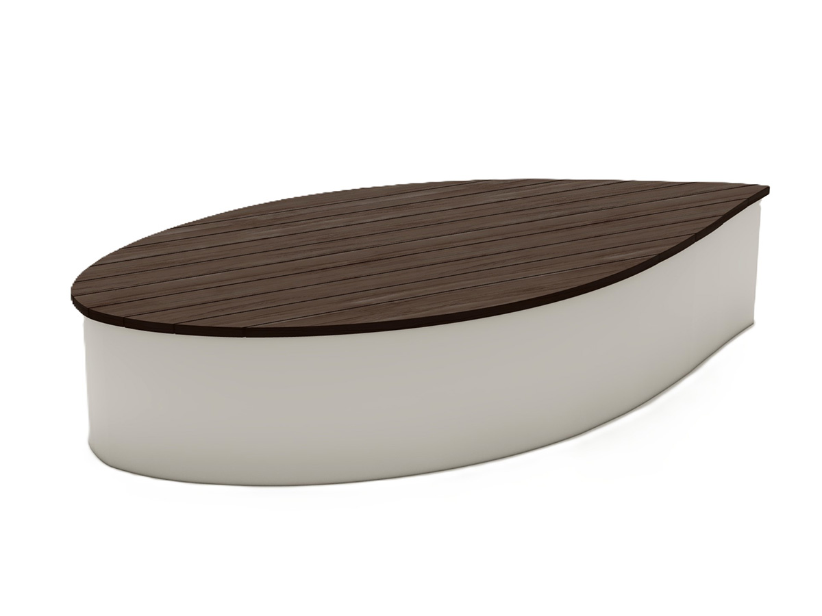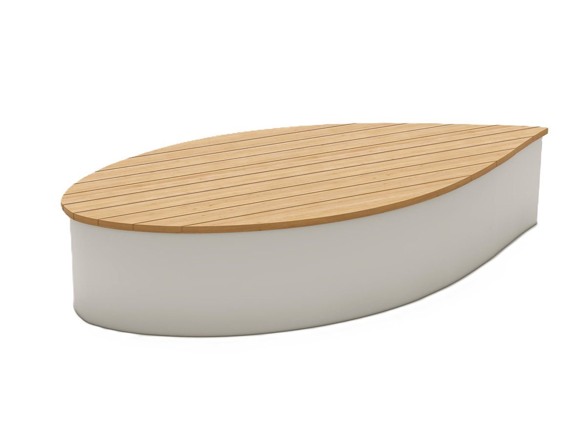 Banco plataforma em forma de folha, que alia design contemporâneo, conforto e consciência ambiental. Este equipamento distingue-se pela sua origem verdadeiramente sustentável: é produzido a partir de fragmentos reciclados de pás de turbinas eólicas em fim de vida, transformando resíduos industriais em mobiliário urbano com elevado valor social e ecológico. Ao dar uma nova função a materiais que outrora captaram os ventos da transição energética, esta peça incorpora plenamente os princípios da economia circular e contribui ativamente para os Objetivos de Desenvolvimento Sustentável (ODS), com especial destaque para o ODS 12 – Produção e Consumo Sustentáveis – e o ODS 13 – Ação Climática. Com o seu formato suave e orgânico, inspirado na silhueta de uma folha, oferece uma superfície ampla e acessível — ideal para sentar, deitar ou simplesmente desfrutar do espaço envolvente. A superfície superior, composta por ripas de madeira de larício, confere conforto, resistência e um toque natural ao conjunto. Ideal para zonas de passagem com grande fluxo pedonal, este modelo compacto oferece o equilíbrio perfeito entre funcionalidade e economia de espaço.