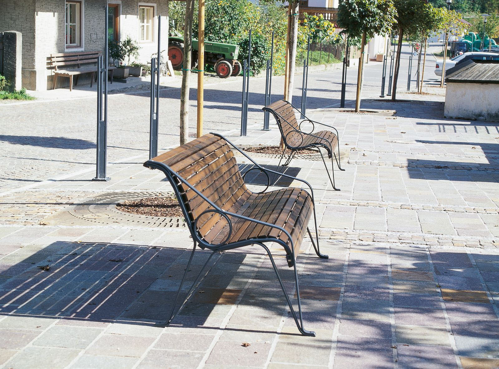 Materiais: Pés, apoio de mãos e estrutura em aço plano galvanizado a quente com 35x8mm e revestimento em pó na cor RAL 7016 ou outra à escolha (cores especiais ou metálicas podem ter acréscimo de preço). Assento e encosto em ripas de madeira exótica FSC.