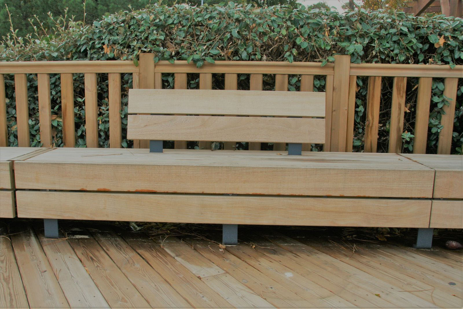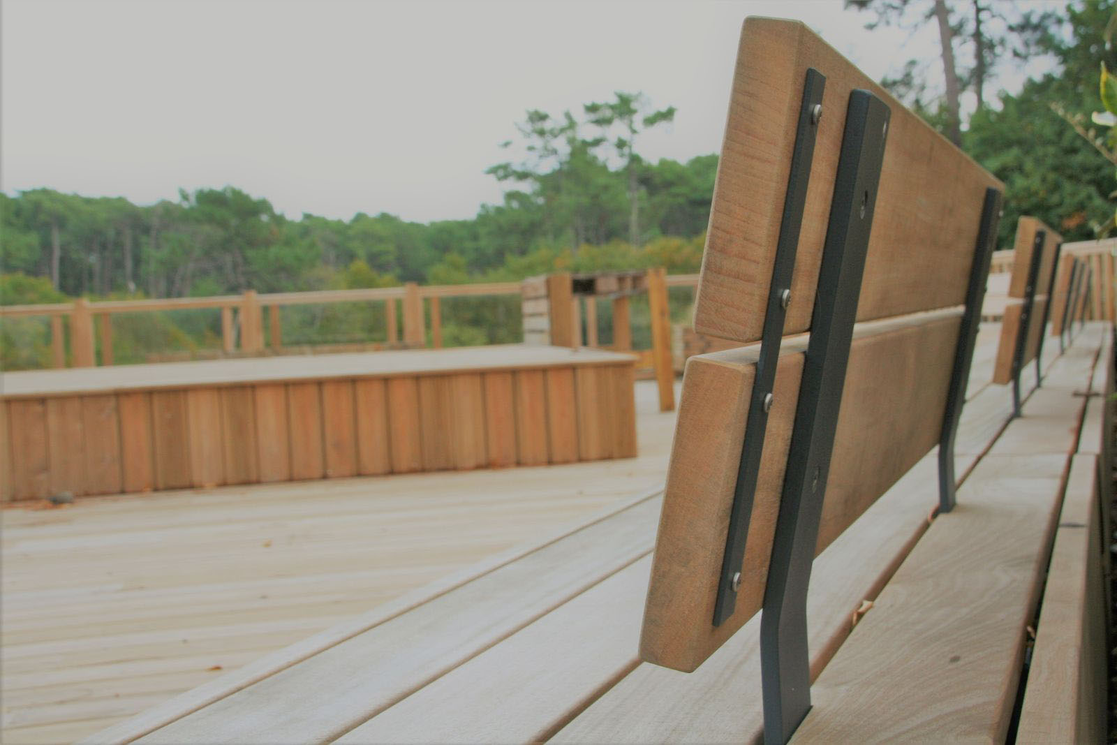 Assento e encosto em ripas de madeira exótica com 100% certificação FSC, à cor natural da madeira, sem necessidade de tratamento ou pintura. Com o tempo a tonalidade da madeira passa de castanho claro a acinzentada, correspondente a um processo natural de envelhecimento que não compromete a sua resistência ou durabilidade.