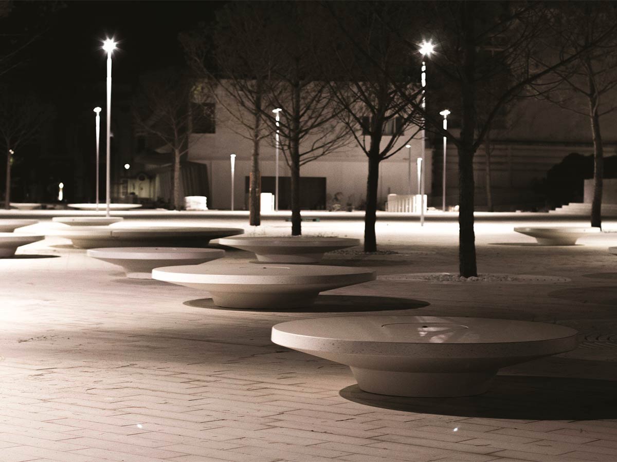 Banco composto por assento em forma de disco com base cónica, concebido em Granito Reconstituído, material que garante elevada resistência, durabilidade e um acabamento nobre e contemporâneo. Este banco apresenta um design em consola, oferecendo uma silhueta elegante e escultural. No centro do banco integra-se um canteiro circular, que pode funcionar como floreira ou, ser fechado com uma tampa em Granito Reconstituído (incluída no valor). Ideal para espaços públicos contemporâneos, o banco Lidò alia funcionalidade, estética e sustentabilidade.
