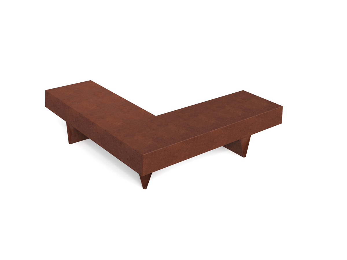 Banco modular, sem encosto, composto por uma estrutura monolítica em forma de “L”, em aço corten, com três apoios. Inclui tratamento de anti lavagem, um complemento necessário para fixação do metal e anti manchas (ref. 1980055).