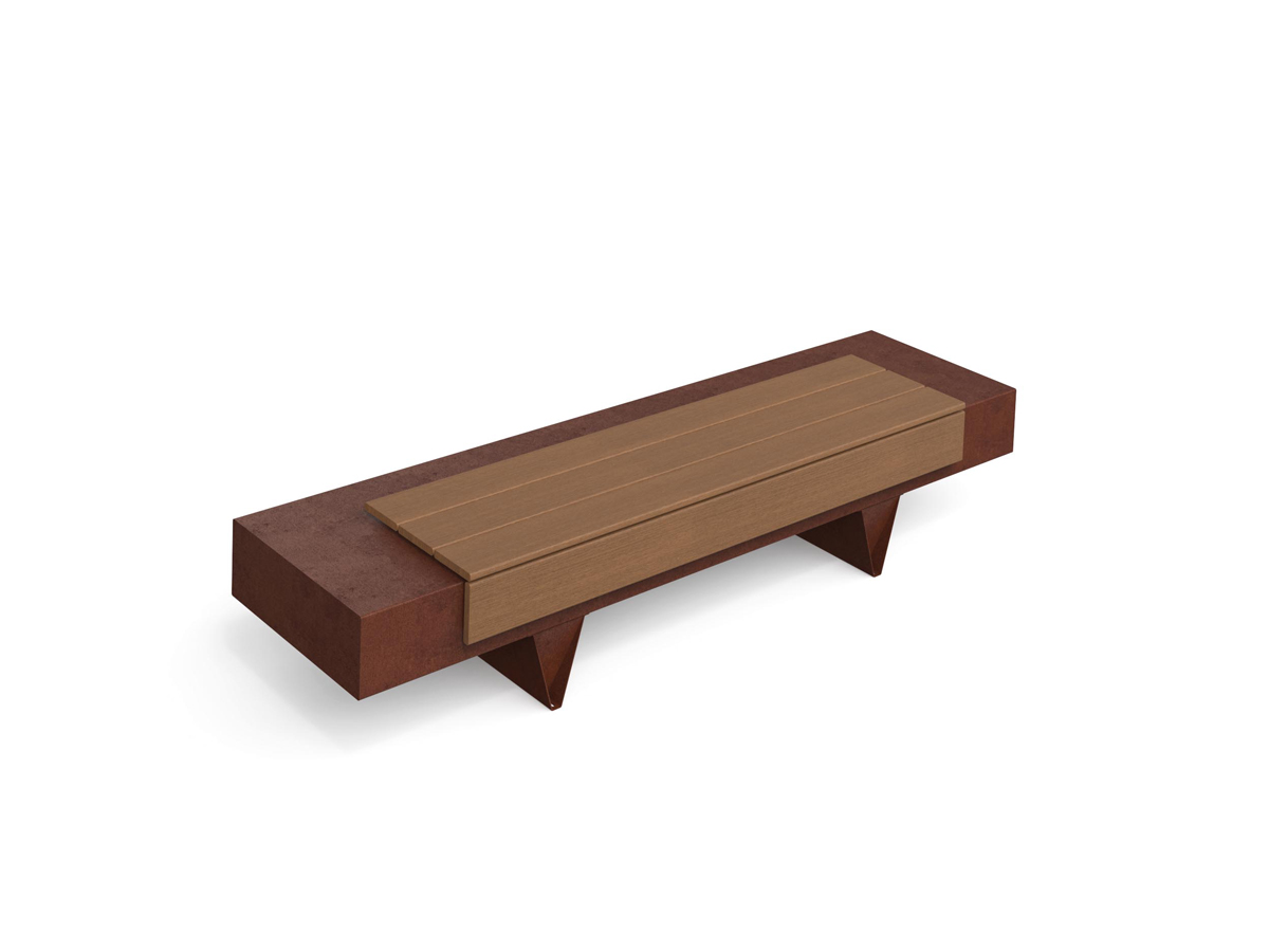 Banco modular, sem encosto, composto por uma estrutura monolítica linear, em aço corten, com assento plano duplo em WPC Plus, um compósito feito com plásticos reciclados e resíduos da indústria da madeira, e com dois apoios de suporte. Inclui tratamento de anti lavagem, um complemento necessário para fixação do metal e anti manchas (Ref. 1980055).