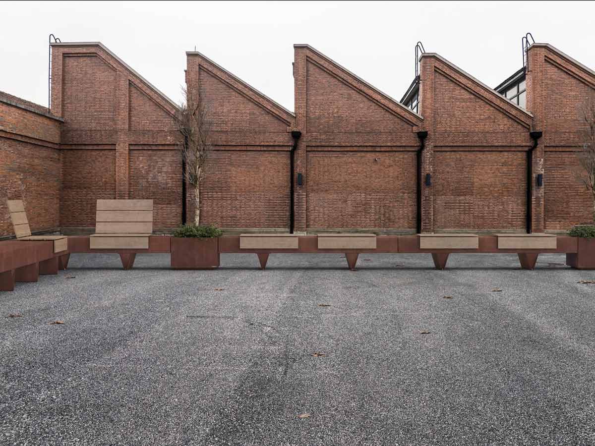 Materiais: Estrutura em aço corten. Assento em WPC (Wood Polymer Composite), um material que não apresenta corrosão e é altamente resistente ao apodrecimento, decomposição e ataque de fungos e parasitas, embora absorvam água nas fibras de madeira incorporadas ao material.