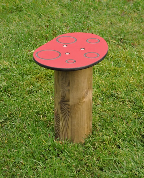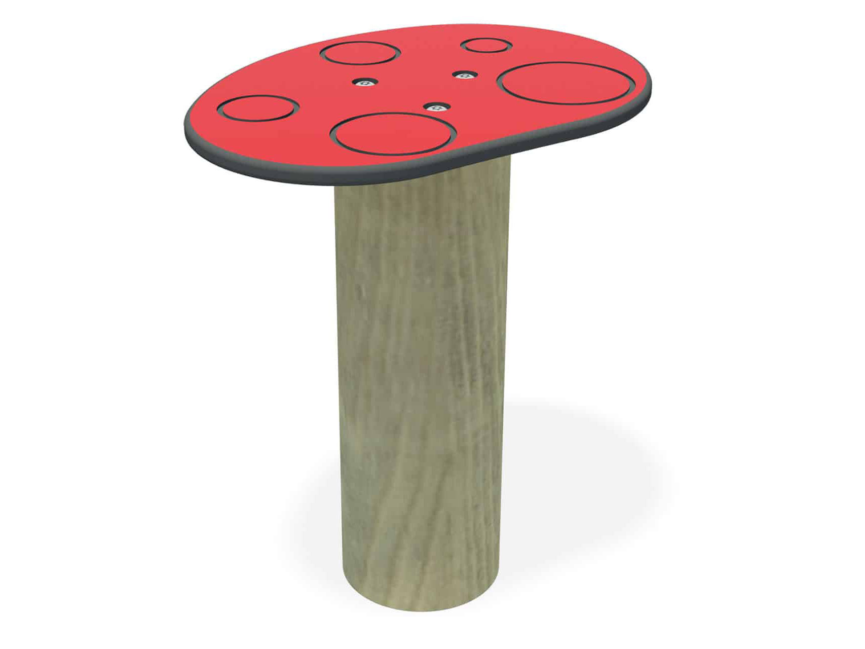 Banco de madeira, composto por um poste central redondo, em madeira, e um assento em laminado compacto colorido com gravação de pequenos relevos circulares. Para fixação a sapata de betão com 40cm de profundidade.