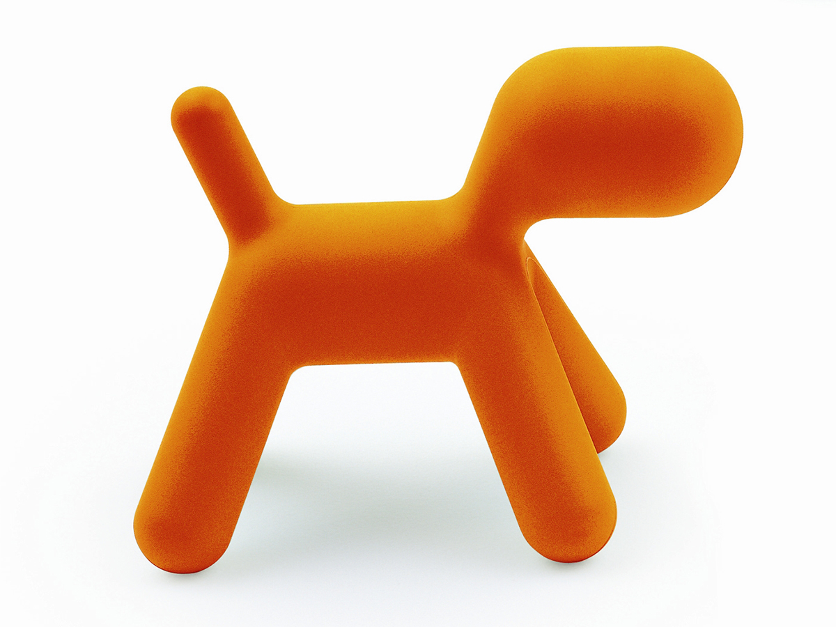 Banco em plástico reforçado para uso interior ou exterior, em forma de cão e com acabamento mate. Disponível nas cores verde, laranja e branco.