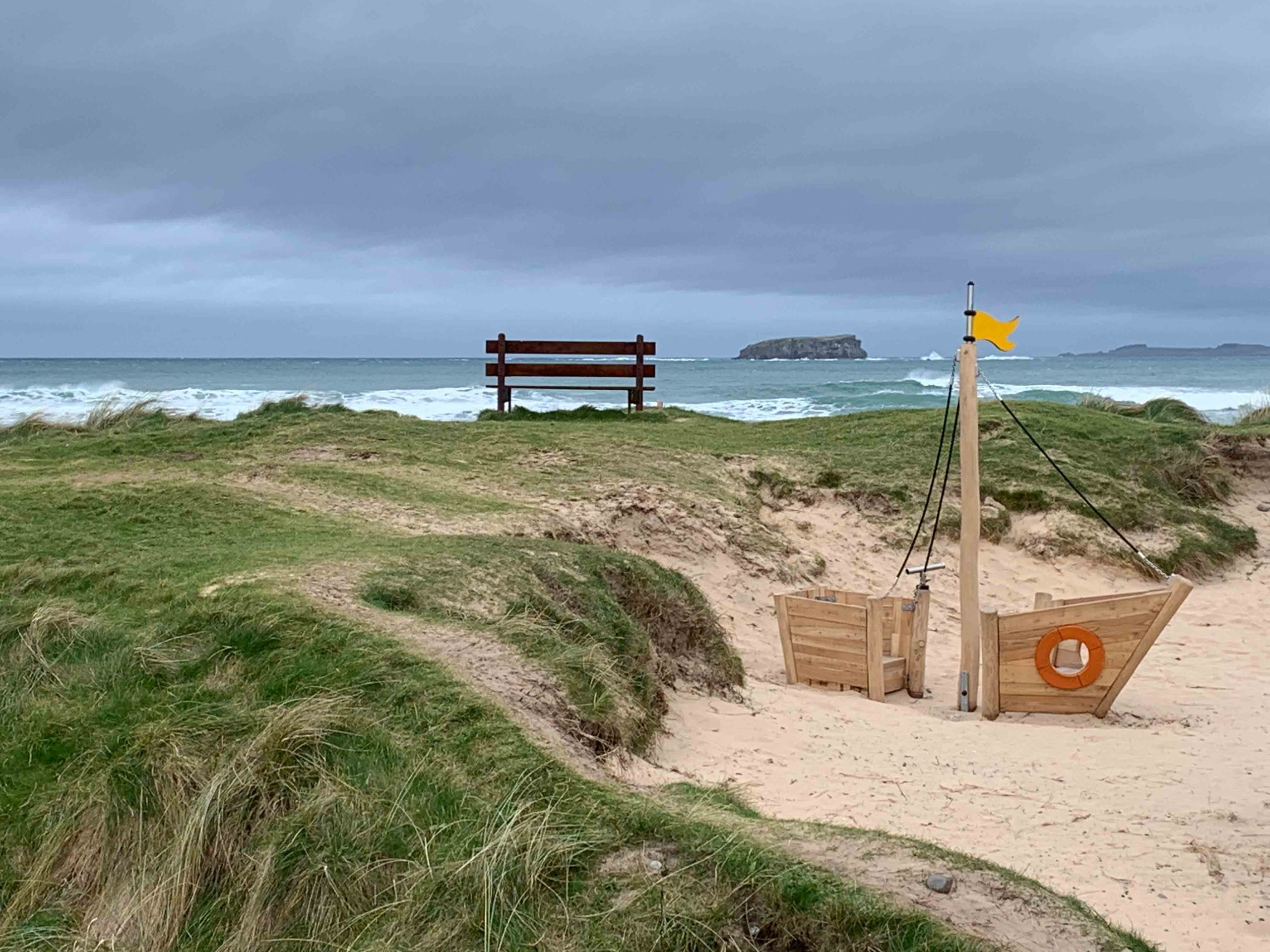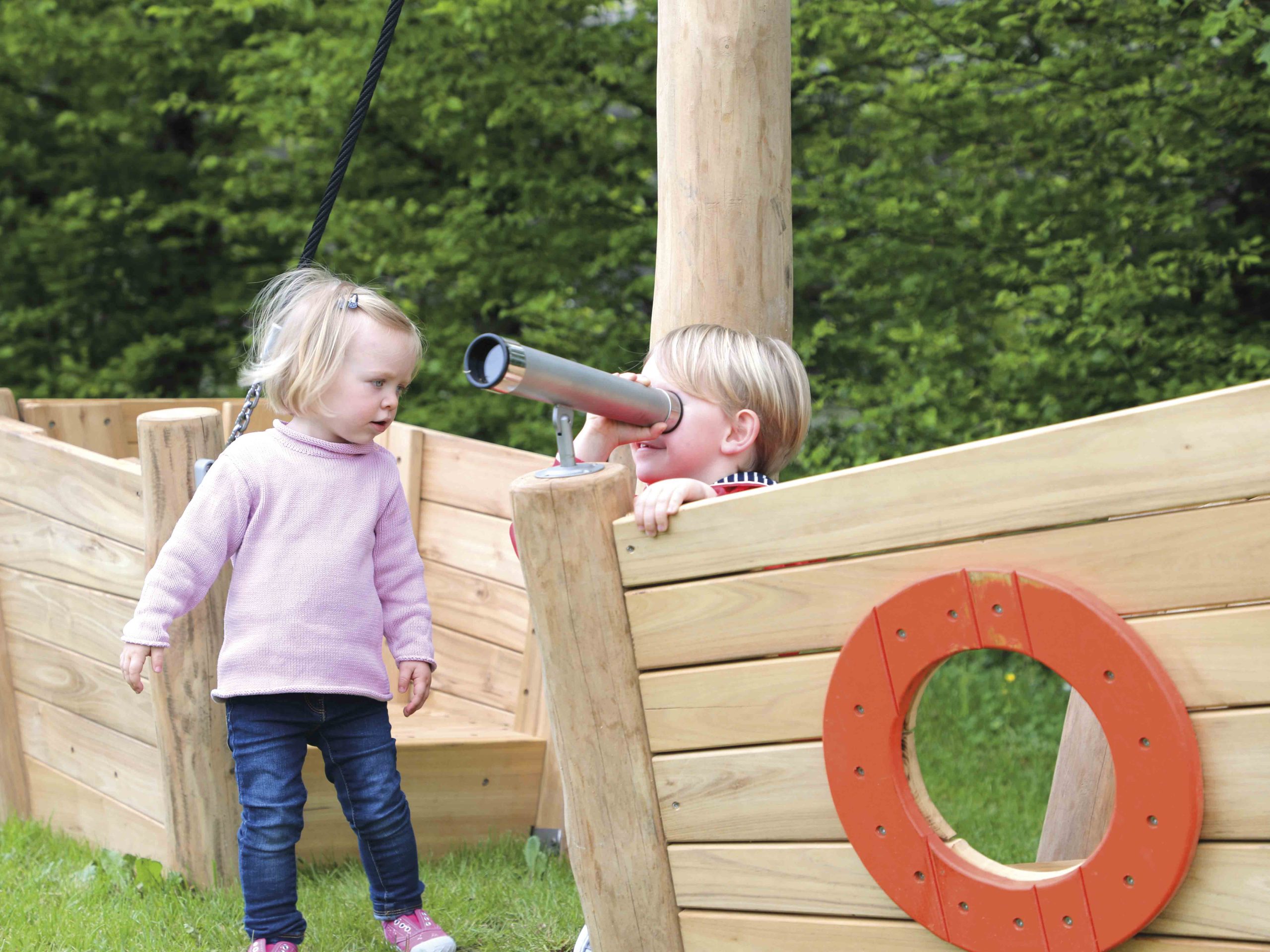 Barco de brincar feito em madeira de robínia, com cordas a fazer de velas, uma bandeira, 1 telescópio e 2 janelas redondas para espreitar. Ideal para brincar ao “faz de conta”, esconder, descansar, socializar, estímulo visual e cognitivo.