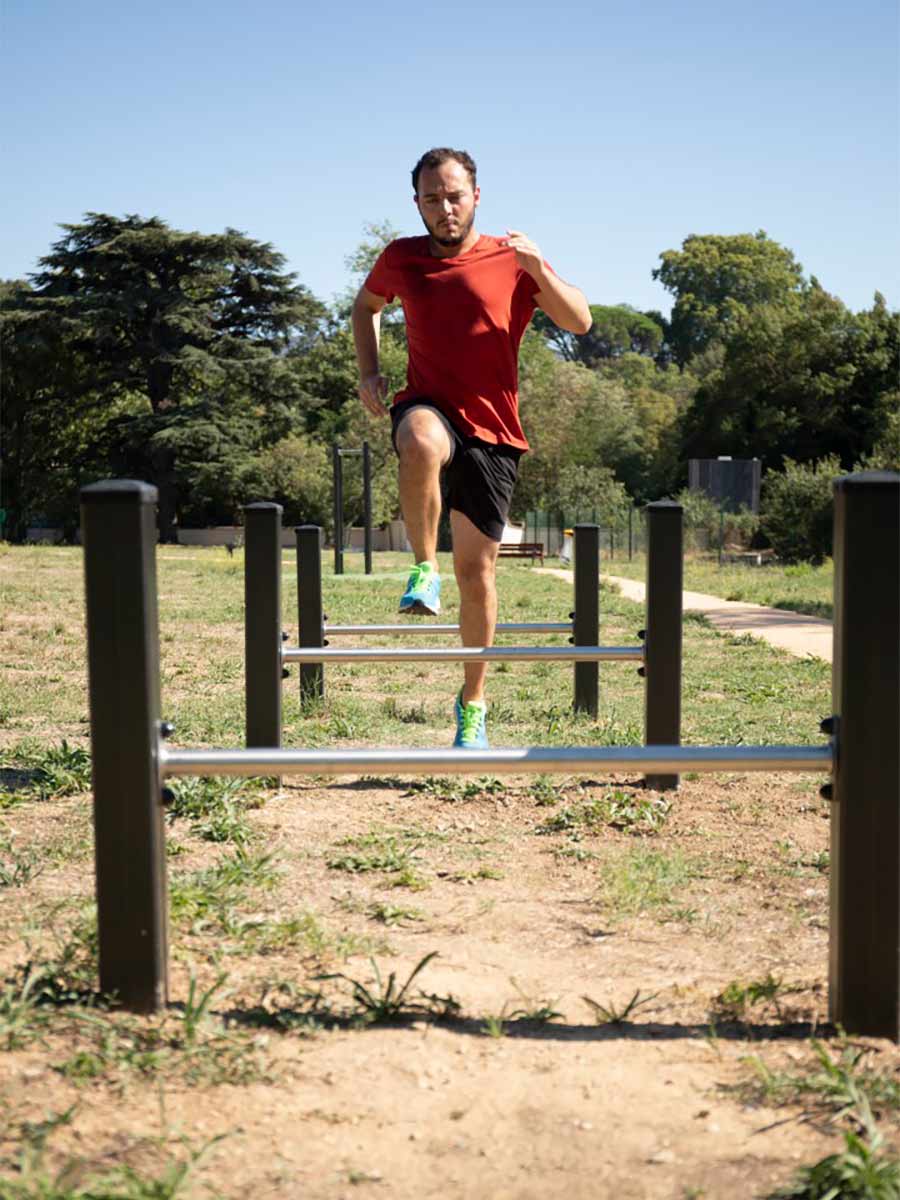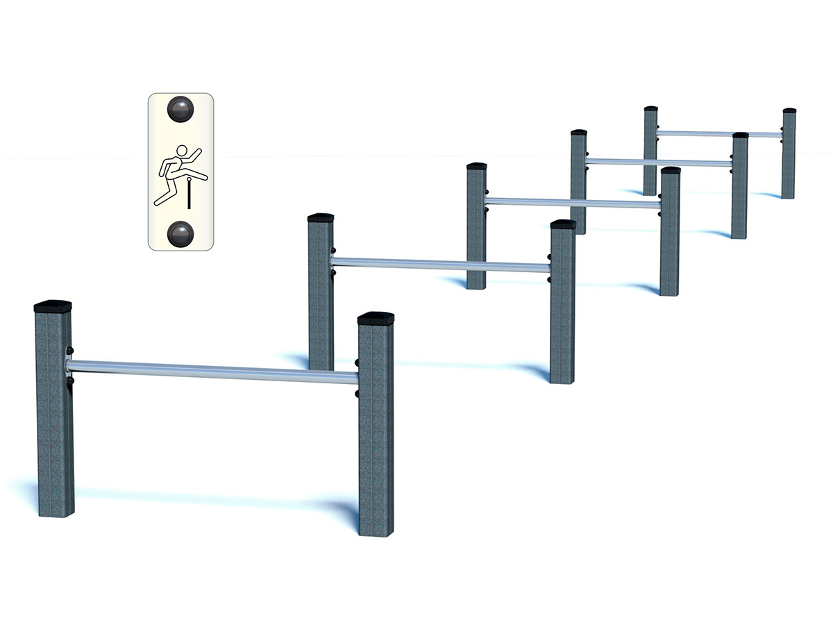 Equipamento de exercício, barras de saltos júnior metálicas, composto por 10 postes em aço pintado e 5 barras em aço.