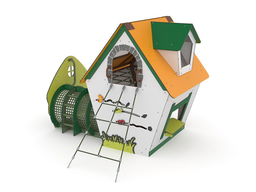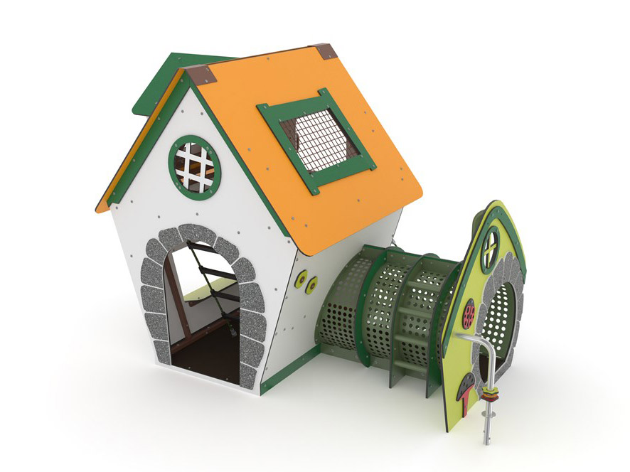 Centro de atividades temático, que remete para a natureza e para as personagens dos contos de fadas. Composto por uma casa com 2 andares, separados por uma rede horizontal, um acesso ao nível do solo em túnel horizontal metálico perfurado, um acesso ao nível do solo por uma pequena ponte, em forma semi-tubular, com pórtico circular de entrada e com um jogo do abaco por cima com peças coloridas deslizantes, um acesso exterior direto ao segundo andar por uma rede inclinada para trepar, 2 pegas de apoio para as mãos, uma saída por um escorrega reto em polietileno, uma escada de corda para acesso ao segundo andar através do interior da casa, uma janela com balcão no piso inferior, uma prateleira de loja no interior no piso inferior, um painel de jogo com 3 ranhuras e peças deslizantes, para manusear e treino da motricidade fina, localizado na fachada da casa, ao nível do solo por baixo da rede inclinada e várias janelas para espreitar. Ideal para trepar, escorregar, sentar, rastejar, dependurar, equilibrar, manusear, espreitar, brincar ao “faz de conta”, socializar, desenvolvimento da coordenação motora e estímulo cognitivo.