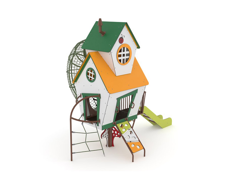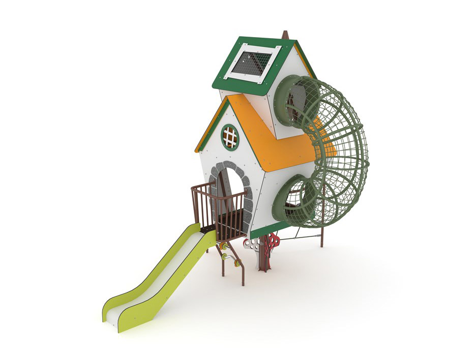 Centro de atividades temático, que remete para a natureza e para as personagens dos contos de fadas, com a forma de duas casas empilhadas, e elevadas do solo, ao estilo de casa na árvore. Composto por uma casa elevada do solo, com um pequeno poste central de apoio decorado com um cogumelo, com acesso através de uma rede vertical para trepar, outro acesso por uma rampa de escalada com pequenas aberturas de apoio para trepar e 2 pegas de apoio de mãos, e por uma zona tipo miradouro, com varandins e uma saída através de um escorrega reto em polietileno. Esta casa encontra-se unida a outra casa, empilhada no seu telhado, compreendendo assim dois andares, separados por uma rede horizontal, e ligados por um túnel metálico curvo exterior para trepar, com uma escada de corda para acesso ao andar superior através do interior da casa. Compreende ainda um jogo do ábaco ao nível do solo, por baixo do varandim, com um carril direito com peças deslizantes e um carril curvo com peças deslizantes e, nas fachadas das casas, várias janelas para espreitar. Equipamento ideal para trepar, escorregar, sentar, rastejar, dependurar, equilibrar, manusear, espreitar, brincar ao “faz de conta”, socializar, desenvolvimento da coordenação motora e estímulo cognitivo.