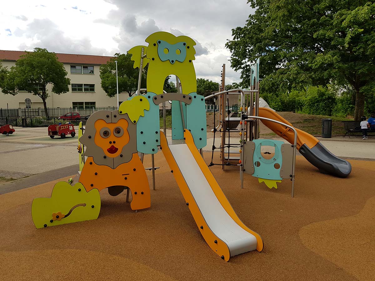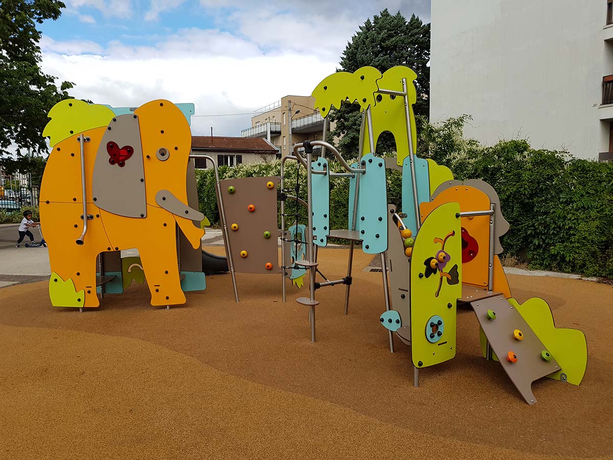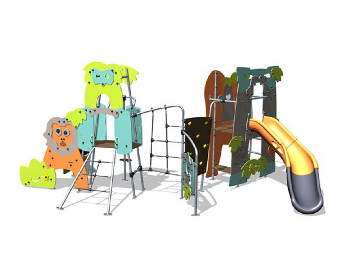 Torre de actividades temática, Adventure, composta por perfis metálicos e painéis decorativos HPL e três torres. Uma das torres tem acesso à plataforma superior por parede de trepar inclinada com presas de escalada, 1 parede vertical com jogos de motricidade, 1 parede com jogo do ábaco e painel decorativo em forma de um leão rodeado de vegetação. Esta torre encontra-se ligada a outra torre com a forma de um mocho por um degrau interno. A torre do mocho tem também acesso por uma escada inclinada metálica com degraus de rede, e saída por varão de bombeiro com 3 apoios para pés a alturas diferentes. Esta torre encontra-se ligada a uma parede vertical de perfil metálico com cordas, por sua vez, unida a um painel lúdico com um explorador e a uma parede de escalada vertical com presas coloridas. A parede de escalada vertical encontra-se ligada à última torre, com a forma de um elefante e uma borboleta, rodeado de vegetação, com 1 plataforma interior a 1,17m de altura. No piso inferior, e no interior, encontram-se 2 bancos corridos. No topo da torre, e no interior, temos um telefone sem fios, que comunica com o exterior, e uma saída por 1 escorrega aberto curvo em polietileno com 1,17m de altura. Ideal para escalar, trepar, suspender, equilibrar, escorregar, socializar, brincar ao faz de conta, estímulo cognitivo e sensorial.