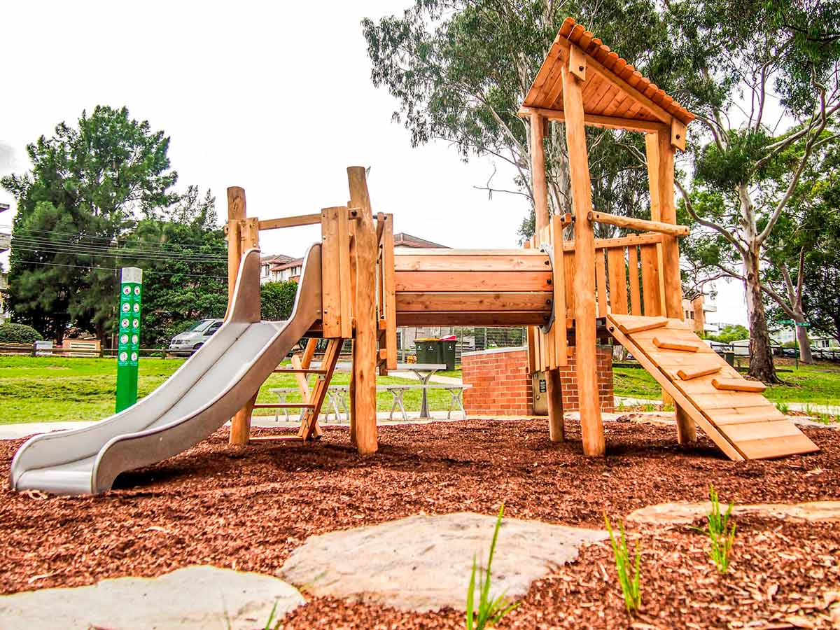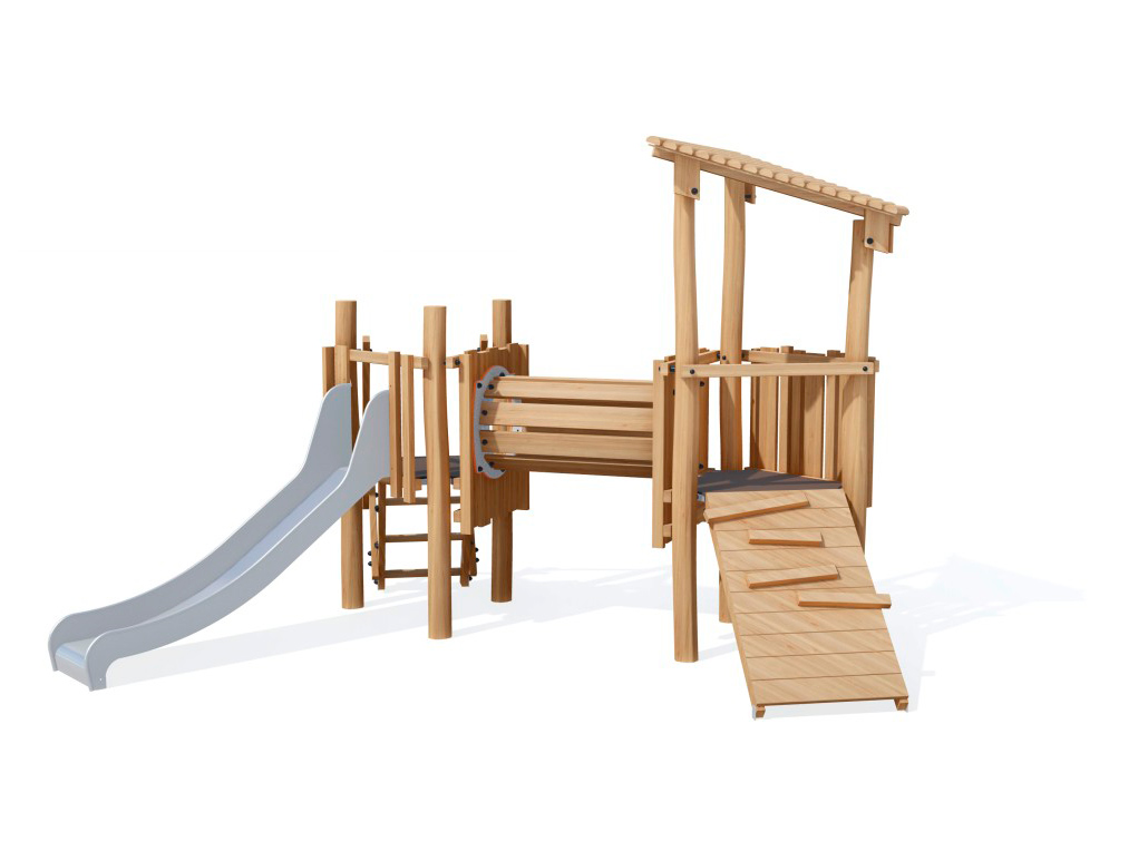 Centro de actividades, em madeira de robínia, composto por 1 torre com telhado, com guardas e com plataforma a 0,97m de altura, 1 rampa de acesso com suportes para trepar e escalar, com 0,97m de altura, 1 túnel, 1 torre sem telhado com 1 plataforma triangular a 0,97m de altura, com guardas, sem telhado, 1 escada de acesso e 1 escorrega a 0,97m de altura. Ideal para escorregar, socializar, atravessar, brincar ao “faz de conta”, rastejar, esconder e trepar.