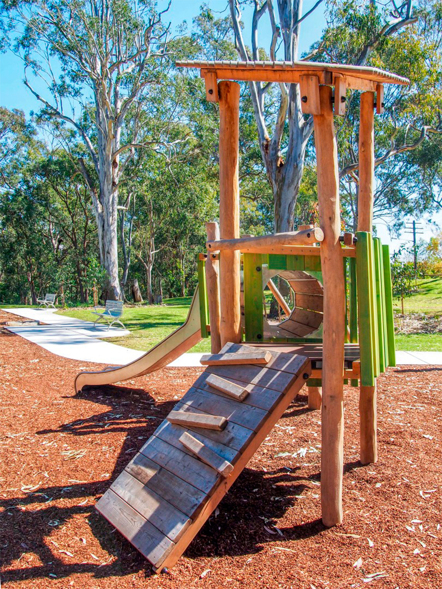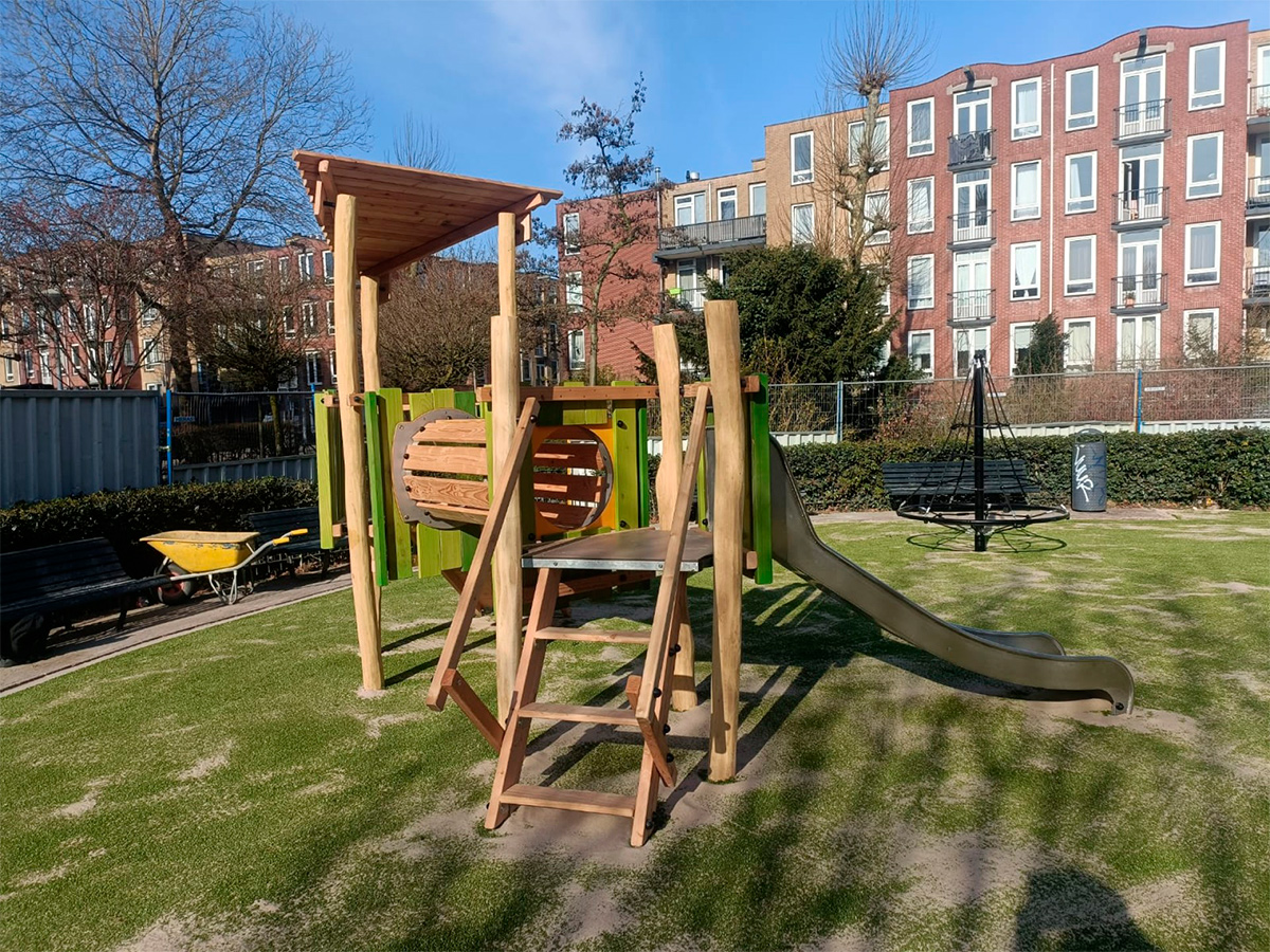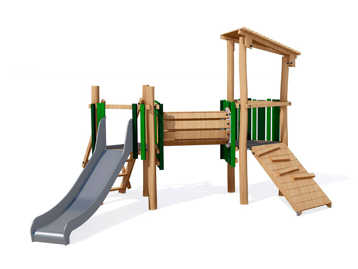 Materiais: Os diferentes postes (60 a 80mm/ 100 a 120mm/120 a 140mm de diâmetro) são feitos de robínia sem seiva e sem casca. A madeira de robínia é lixada e como é naturalmente à prova de podridão não requer nenhuma proteção química adicional. É igualmente extremamente resistente a ataques de fontes externas (insetos, fungos, variações climáticas), garantindo a durabilidade a longo prazo ao equipamento. Os painéis, a parede de escalada, os degraus e o túnel, são feitos de larício (pranchas de 140 x 27mm / 45 x 68mm), naturalmente resistente e duradouro. Os painéis coloridos são tingidos em tonalidades de verde. O telhado é feito de troncos de larício (80 x 40 mm). As plataformas são feitas de um material compacto antiderrapante (HPL) de 12,5 mm de espessura. Um reforço adicional é fornecido por suportes de aço galvanizado, localizados na parte inferior das plataformas. O escorrega é feito de aço inoxidável. Fixações de aço inoxidável protegidas por tampas antivandalismo em poliamida.