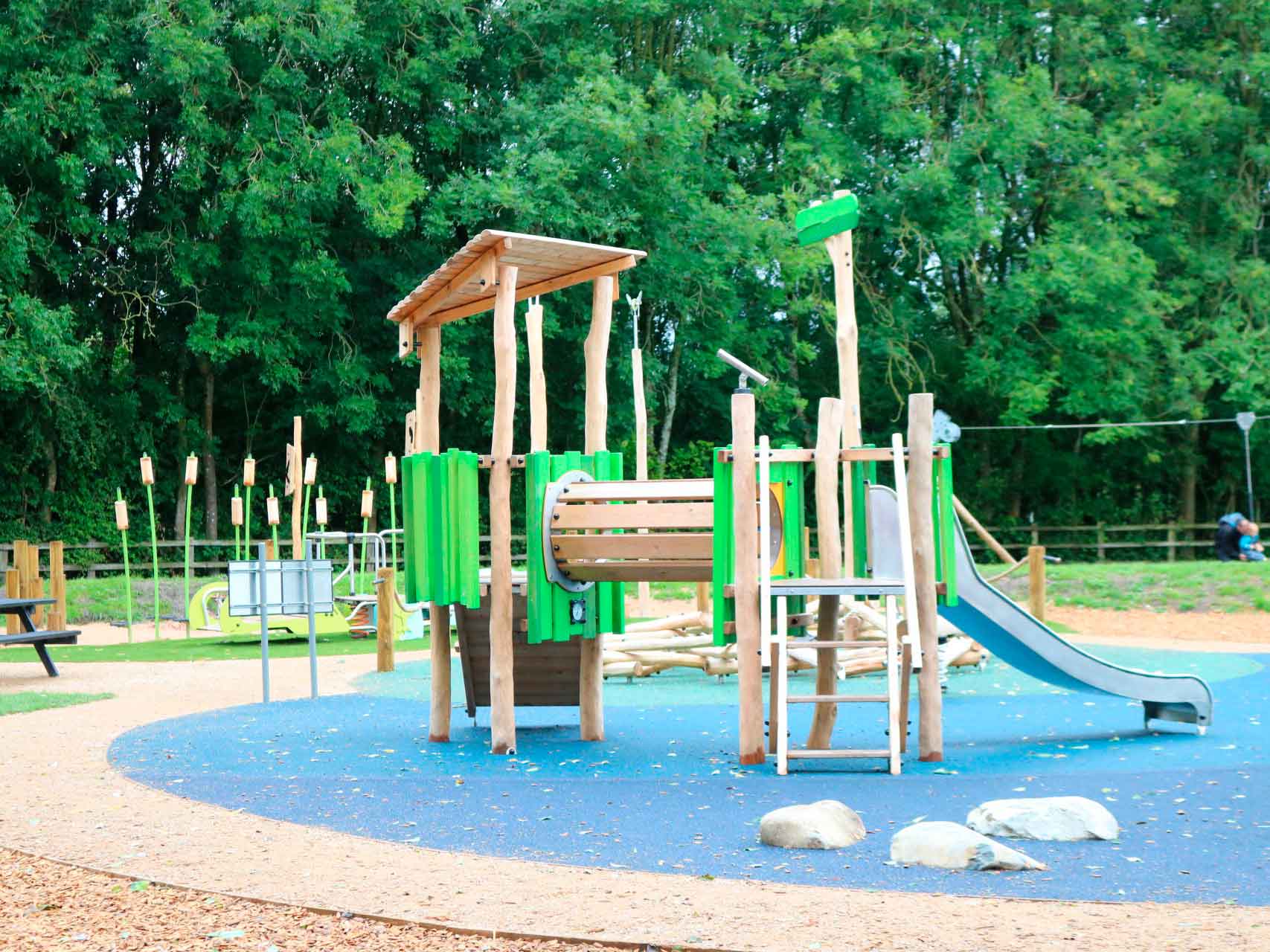 Centro de actividades composto por 6 troncos de madeira com várias alturas, 1 trave de equilíbrio, 3 barras de equilíbrio a 3 alturas diferentes; 1 parede de cordas vertical para trepar; 1 torre com painéis coloridos, com telhado de 2 águas e janela, e saída por escorrega de aço inoxidável. Ideal para equilibrar, escorregar, esconder, trepar, suspender, socializar, coordenação motora e superação de obstáculos.