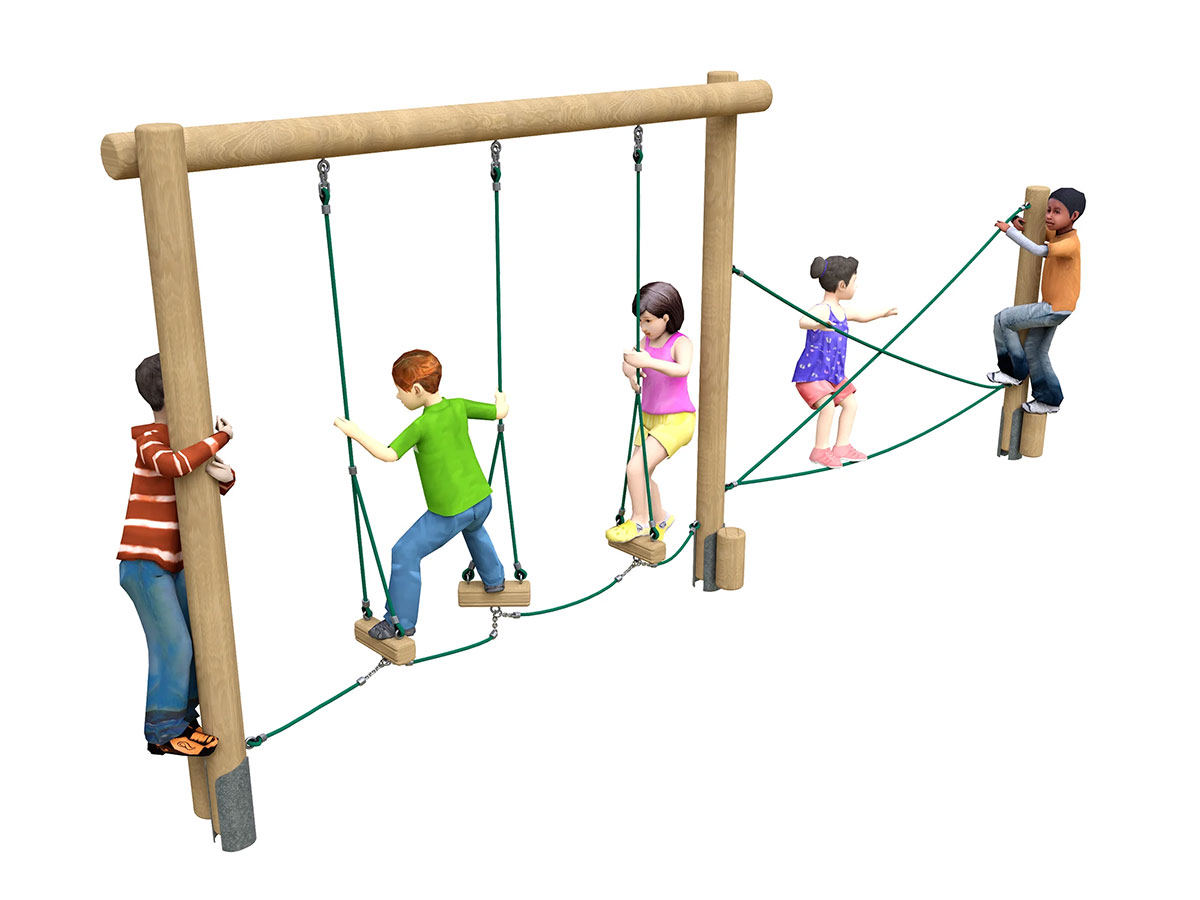 Materiais: Postes de madeira laminada de alta qualidade, redondos, de pinho de crescimento extremamente lento, retirado de florestas totalmente sustentáveis ​​com acreditação FSC ou PEFC, com secções produzidas de acordo com a norma EN 386: 2001, bordas salientes acabadas com um raio maquinado para conferir um acabamento suave e sem lascas de acordo com a EN 1176, e sujeitos a tratamento a alta pressão de acordo com as EN 351-1 e EN 335-2, isento de crómio e arsénio. Cordas com núcleo de aço resistente ao vandalismo; os pontos terminais são de aço hidraulicamente pressionado ou de ponteiras de alumínio com parafusos de aço inox (A2).
