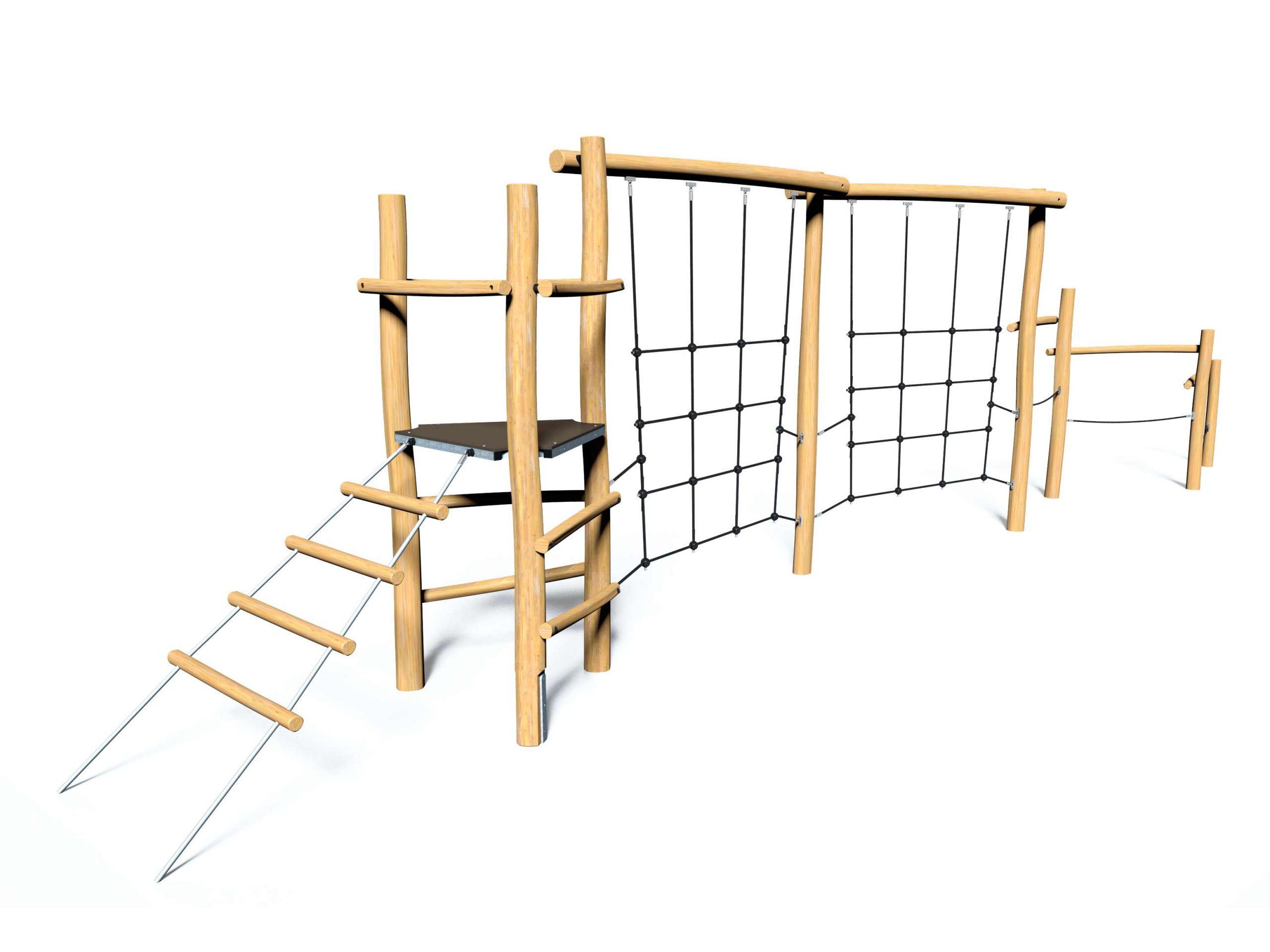 Materiais: Os diferentes postes (60 a 80mm/ 100 a 120mm/120 a 140mm de diâmetro) são feitos de robínia sem seiva e sem casca. A madeira de robínia é lixada e como é naturalmente à prova de podridão não requer nenhuma proteção química adicional. É igualmente extremamente resistente a ataques de fontes externas (insetos, fungos, variações climáticas), garantindo a durabilidade a longo prazo ao equipamento. As plataformas são feitas de um material compacto antiderrapante (HPL) de 12,5 mm de espessura. Um reforço adicional é fornecido por suportes de aço galvanizado, localizados na parte inferior das plataformas. As cordas de 16mm de diâmetro são feitas de cabo de aço galvanizado coberto com poliéster. Os cabos são unidos e mantidos no lugar por esferas de poliamida injetada. As correntes são feitas de aço inoxidável. As fixações para as redes e correntes são feitas de alumínio. Fixações de aço inoxidável ou banhado, protegidas por tampas antivandalismo em poliamida.