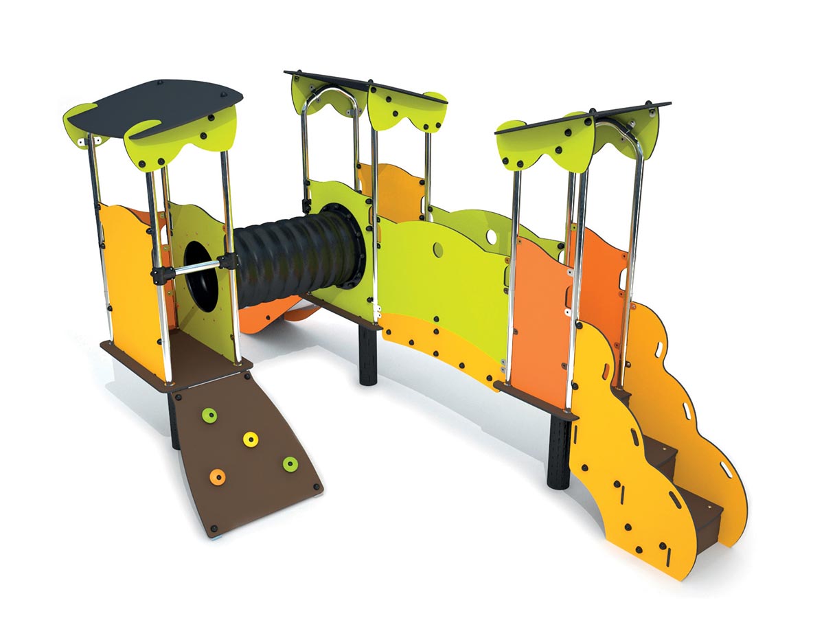 Materiais: Os postes de 125 mm de diâmetro são feitos de aço galvanizado lacado com acabamento granulado cinza de dois tons e superfície levemente ondulada para maior resistência a arranhões. Painéis coloridos de HPL com 13 mm de espessura, com excelente resistência a intempéries e vandalismo. As plataformas e os degraus são feitos de um material compacto texturizado e antiderrapante (HPL), com 12,5 mm de espessura. A passagem de 60 cm de largura é feita de um piso de alumínio chanfrado. Tubos de aço inoxidável, com diâmetro 40mm. Fixações de poliamida moldada por injeção conectam os postes às plataformas e aos vários acessórios de jogo. Elas são não-tóxicas, à prova de fogo e U.V. resistente, e a espessura da poliamida torna o equipamento forte e resistente a vandalismo. A superfície deslizante do escorrega é feita de aço inoxidável com 2 mm de espessura, moldado, dobrado e enrolado em uma única peça. O túnel é feito de polietileno rotomoldado com 45 cm de diâmetro. Presas de escalada de polipropileno, não inflamáveis, não tóxicas e resistentes aos UV. Fixações de aço inoxidável, protegidas por tampas antivandalismo em poliamida.