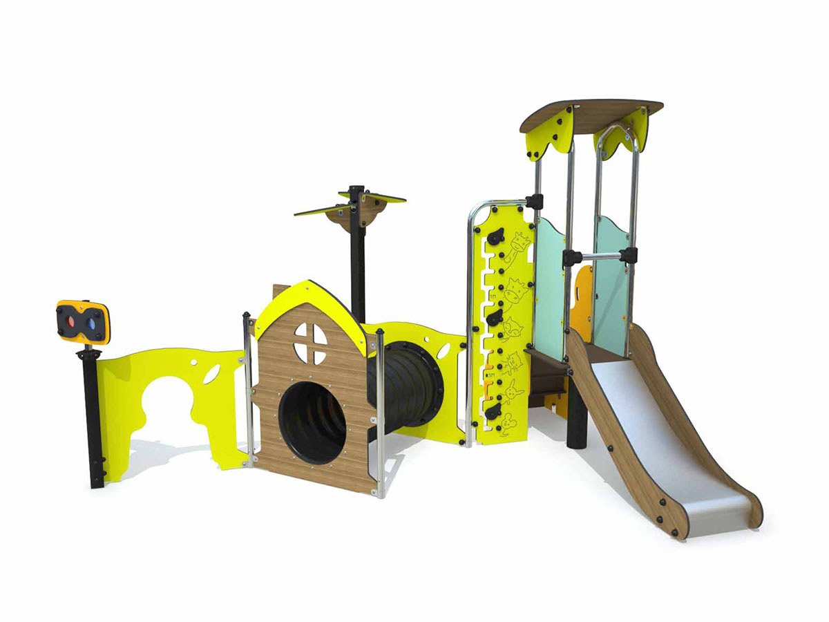 Centro de actividades composto por uma torre com plataforma e telhado com acesso por escadas e saída por escorrega, em poliéster, com 0,60m, 1 painel de jogo medidor de alturas com controlos deslizantes, 1 túnel com uma fachada de casa, 1 poste com cobertura tipo árvore, 1 painel de jogo silhueta e 1 poste com binóculos coloridos. Ideal para escorregar, gatinhar, esconder, trepar, atravessar, estímulo visual, sensorial, cognitivo e social.
