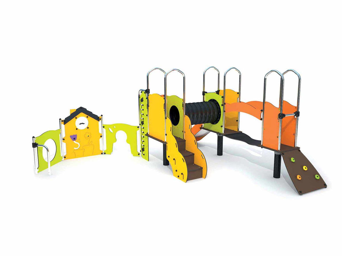 Centro de actividades composto por 3 torres com plataforma sem telhado, 1 parede de escalada inclinada com presas coloridas, 1 túnel, 1 escada com protecções laterais, 1 escorrega, em poliéster, com 0,60m de altura, 1 caminho em ponte com guardas, 1 painel gráfico de marcação de altura, 1 painel de jogo silhueta, 1 painel de jogo alto em forma de casa, 1 painel varandim circular. Ideal para escorregar, gatinhar, esconder, trepar, atravessar, “role play”, estímulo visual, sensorial, cognitivo e social.