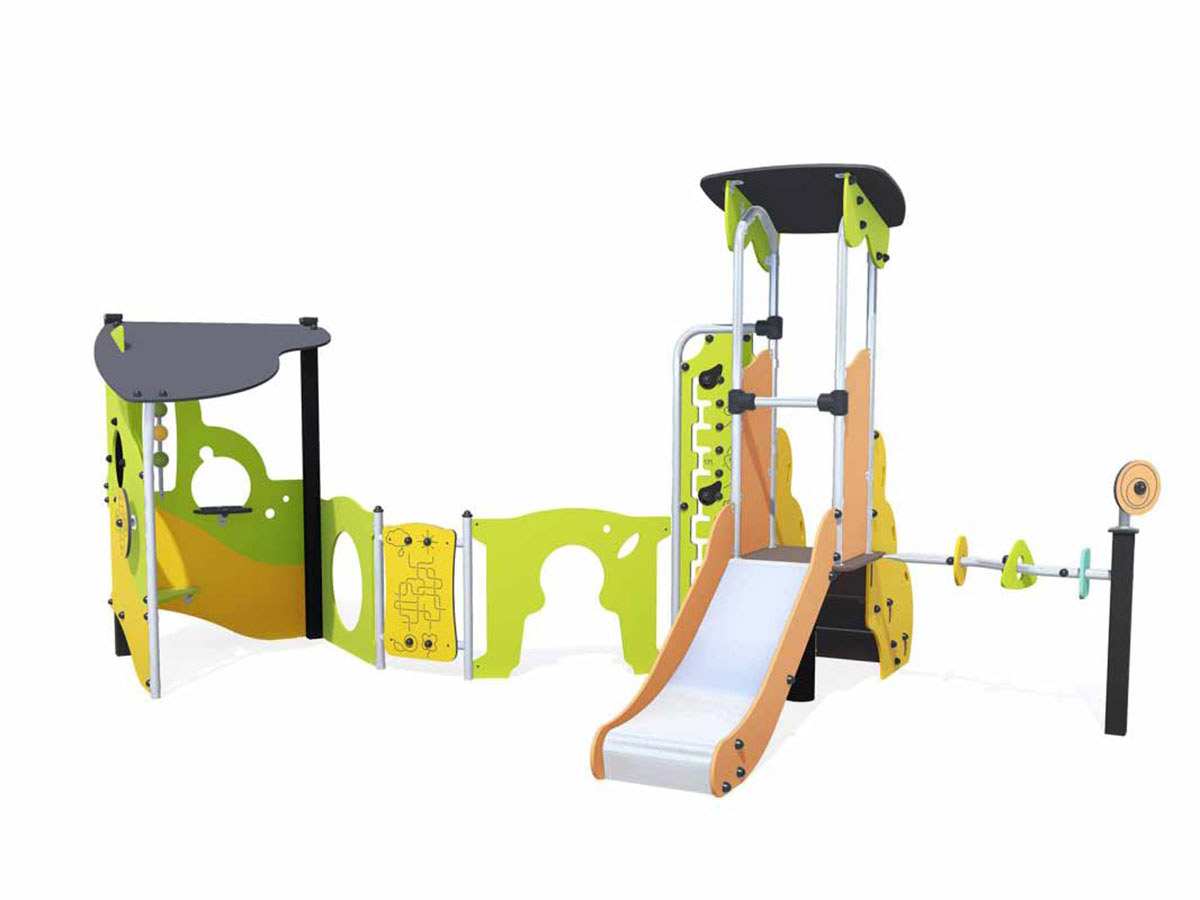 Materiais: Postes de aço galvanizados e pintados com 70x70mm. Os postes de 125 mm de diâmetro são feitos de aço galvanizado lacado com acabamento granulado cinza de dois tons e superfície levemente ondulada para maior resistência a arranhões. Painéis coloridos de HPL com 13 mm de espessura, com excelente resistência a intempéries e vandalismo. As plataformas e os degraus são feitos de um material compacto texturizado e antiderrapante (HPL), com 12,5 mm de espessura. Tubos de aço inoxidável, com diâmetro 40mm. Fixações de poliamida moldada por injeção conectam os postes às plataformas e aos vários acessórios de jogo. Elas são não-tóxicas, à prova de fogo e U.V. resistente, e a espessura da poliamida torna o equipamento forte e resistente a vandalismo. A superfície deslizante do escorrega é feita de poliéster. Os controlos deslizantes da parede de medição de alturas são de polietileno. Fixações de aço inoxidável, protegidas por tampas antivandalismo em poliamida.