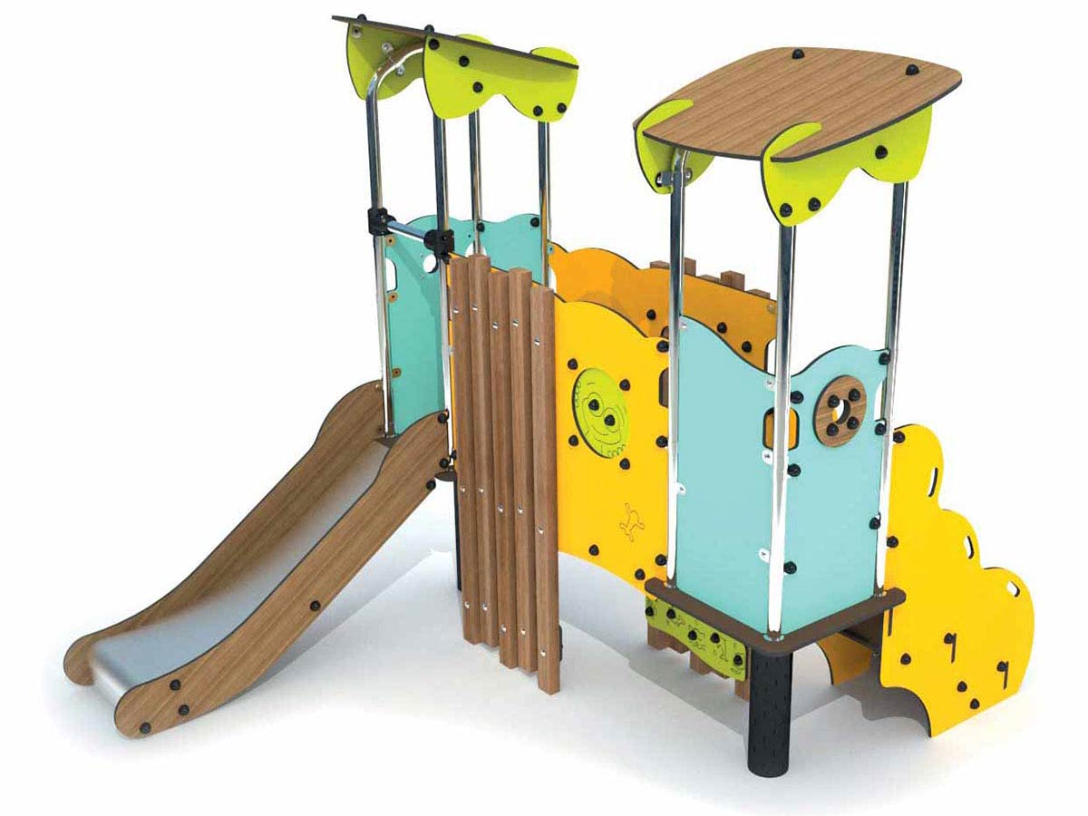Materiais: Os postes de 125 mm de diâmetro são feitos de aço galvanizado lacado com acabamento granulado cinza de dois tons e superfície levemente ondulada para maior resistência a arranhões. Painéis coloridos de HPL com 13 mm de espessura, com excelente resistência a intempéries e vandalismo. As plataformas e os degraus são feitos de um material compacto texturizado e antiderrapante (HPL), com 12,5 mm de espessura. A passagem de 60 cm de largura é feita de um piso de alumínio chanfrado. Tubos de aço inoxidável, com diâmetro 40mm. Fixações de poliamida moldada por injeção conectam os postes às plataformas e aos vários acessórios de jogo. Elas são não-tóxicas, à prova de fogo e U.V. resistente, e a espessura da poliamida torna o equipamento forte e resistente a vandalismo. A superfície deslizante do escorrega é feita de poliéster. Fixações de aço inoxidável, protegidas por tampas antivandalismo em poliamida.
