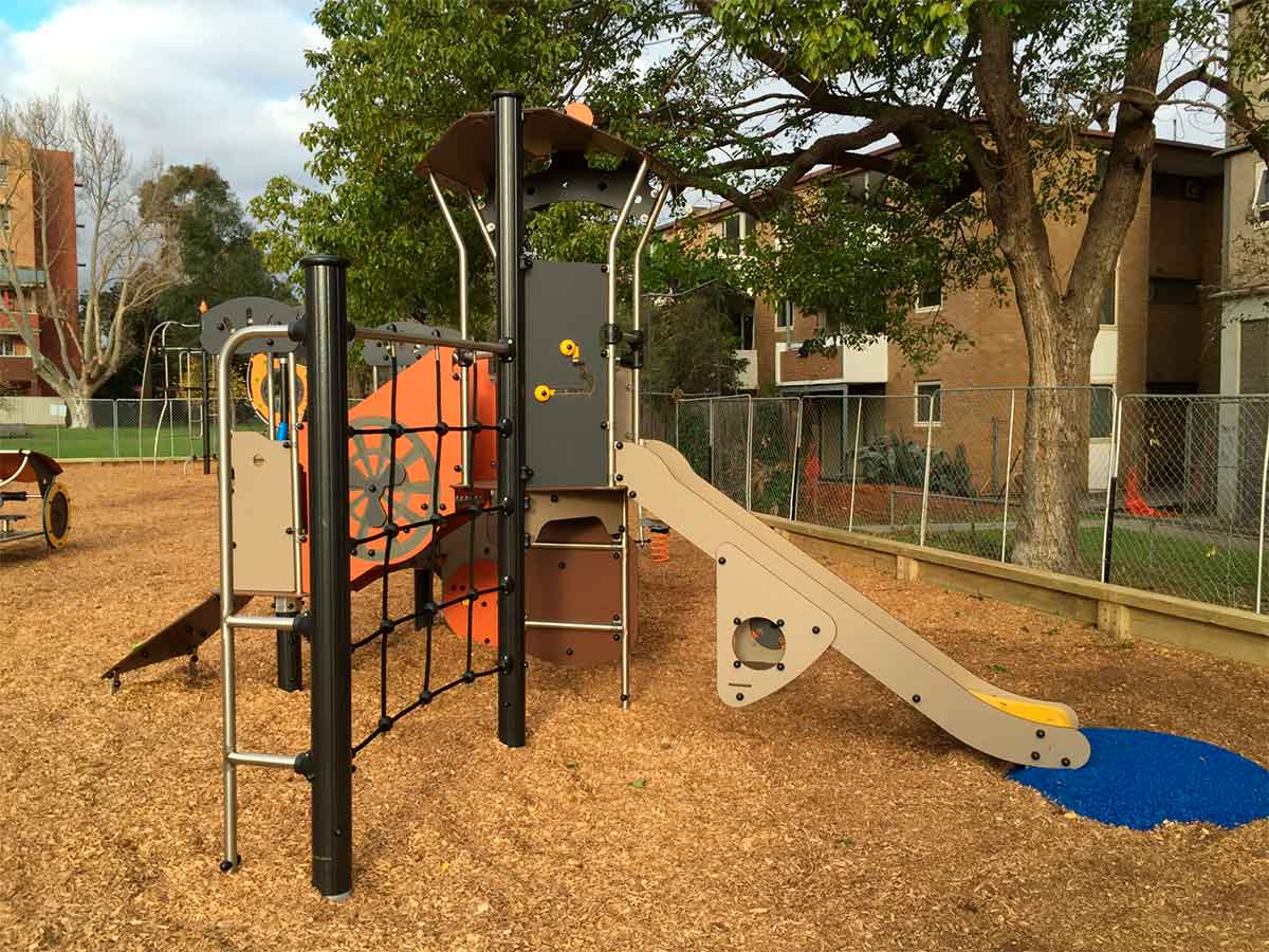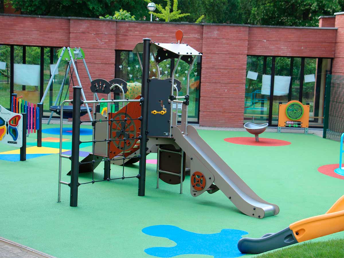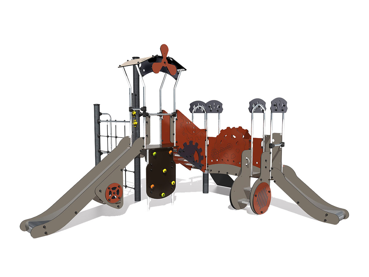 Materiais: Painéis coloridos de HPL com 13 mm de espessura, com excelente resistência a intempéries e vandalismo. As plataformas e as paredes de escalada são feitas de um material compacto texturizado e antiderrapante (HPL), com 12,5 mm de espessura. Tubos de aço inoxidável, com diâmetro 40mm. As fixações de poliamida moldada por injeção são não tóxicas, não inflamáveis, resistentes a choques e a radiação ultravioleta. Elas conferem robustez e proteção contra o vandalismo. Postes com 125 mm de diâmetro, feitos de aço galvanizado lacado, garantindo robustez e durabilidade, com tampas de poliamida moldada por injeção. Os degraus antiderrapantes das escadas são feitos de folhas de alumínio corrugado, garantindo a sua durabilidade. A superfície deslizante do escorrega é feita de aço inoxidável com 2 mm de espessura, moldado, dobrado e enrolado em uma única peça. As cordas são feitas de cabo de aço galvanizado coberto com polipropileno, e os cabos são ligados e mantidos no lugar por conectores de poliamida moldada por injeção. Presas de escalada de polipropileno, não tóxicas, não inflamáveis e resistentes a choques e UV. Fixações de aço inoxidável, protegidas por tampas antivandalismo em poliamida.