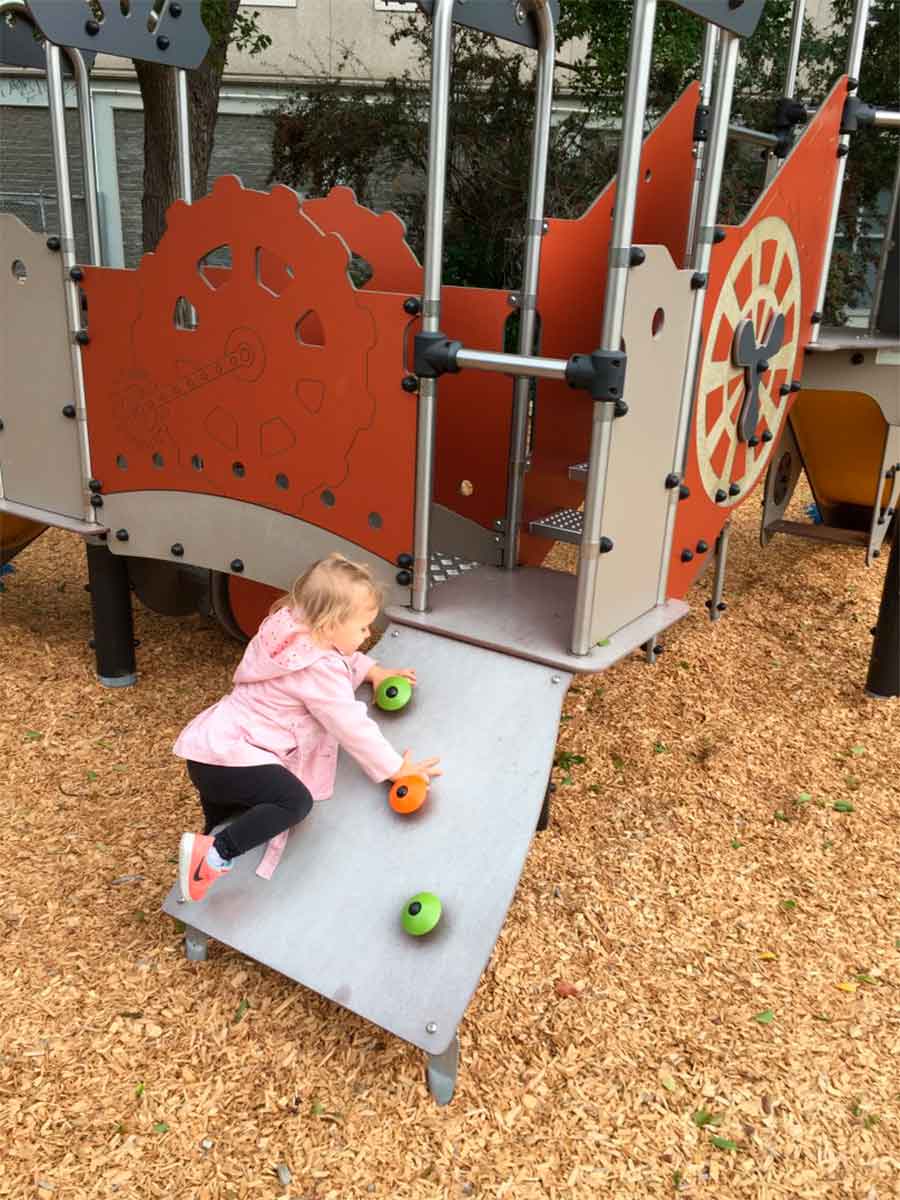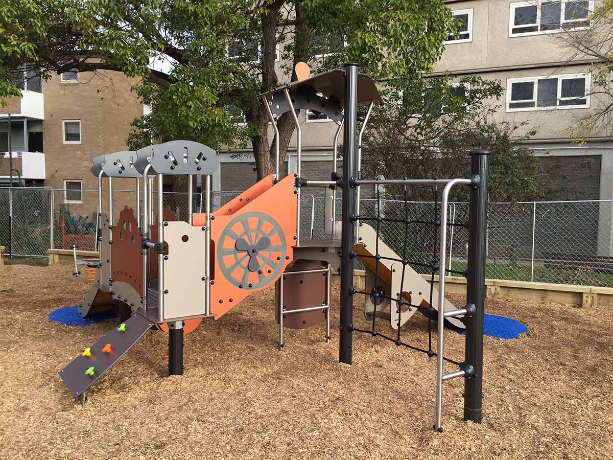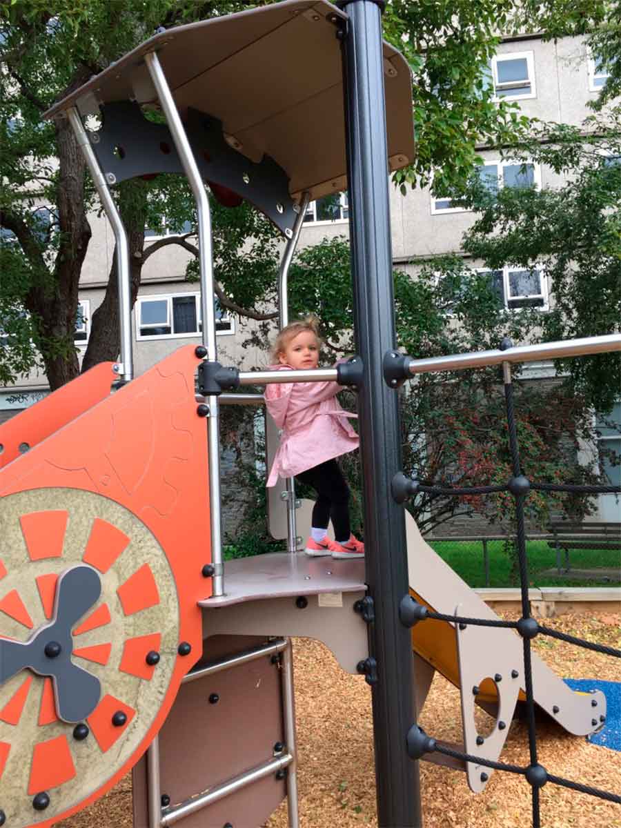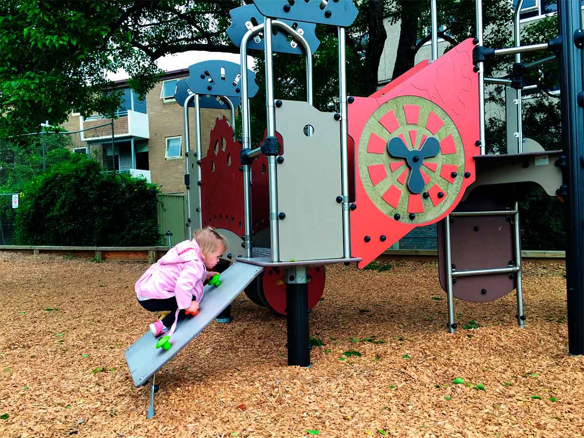 Torre de actividades temática, Metropolis, composta por 1 escada, com guardas temáticas com pegas, que dá acesso a uma plataforma quadrada temática, com 0,60m de altura, com saída por 1 escorrega com 0,60m de altura, 1 ponte, com guardas temáticas, que liga esta plataforma a outra plataforma quadrada temática, a 0,60m de altura, também acessível por 1 parede de escalada inclinada com presas coloridas, 1 ponte em escada, com guardas com decoração temática, que dá acesso a 1 torre temática, com plataforma a 1,17m de altura, com telhado decorado com uma hélice, com 1 painel de jogo dos mecanismos, com saída por 1 escorrega recto com 1,17m de altura e 1 parede de escalada vertical, com presas coloridas, que dá acesso à plataforma mais alta. Inclui ainda uma rede de escalada com um apoio metálico e 1 assento debaixo do escorrega mais alto. Ideal para trepar, escorregar, atravessar, socializar, descansar, esconder, escalar, manusear, brincar ao “faz de conta”, estímulo tátil e cognitivo.