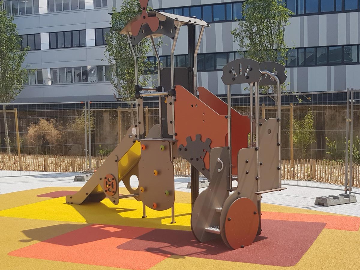 Torre de actividades temática, Metropolis, composta por 1 escada, com guardas com painéis lúdicos e pegas, que dá acesso a 1 plataforma temática quadrada, com 0,60m de altura, 1 ponte em escada, com guardas com decoração temática, que dá acesso a 1 plataforma a 1,17m de altura, com saída por 1 escorrega recto com 1,17m de altura, 1 assento debaixo do escorrega, 1 parede de escalada com presas coloridas, com 1,17m de altura, que dá também acesso à plataforma mais alta, 1 painel de jogo dos mecanismos e 1 telhado decorado com uma hélice. Inclui ainda uma rede de escalada com um apoio metálico e 1 assento debaixo do escorrega. Ideal para trepar, escorregar, atravessar, socializar, descansar, esconder, escalar, manusear, brincar ao “faz de conta”, estímulo tátil e cognitivo.