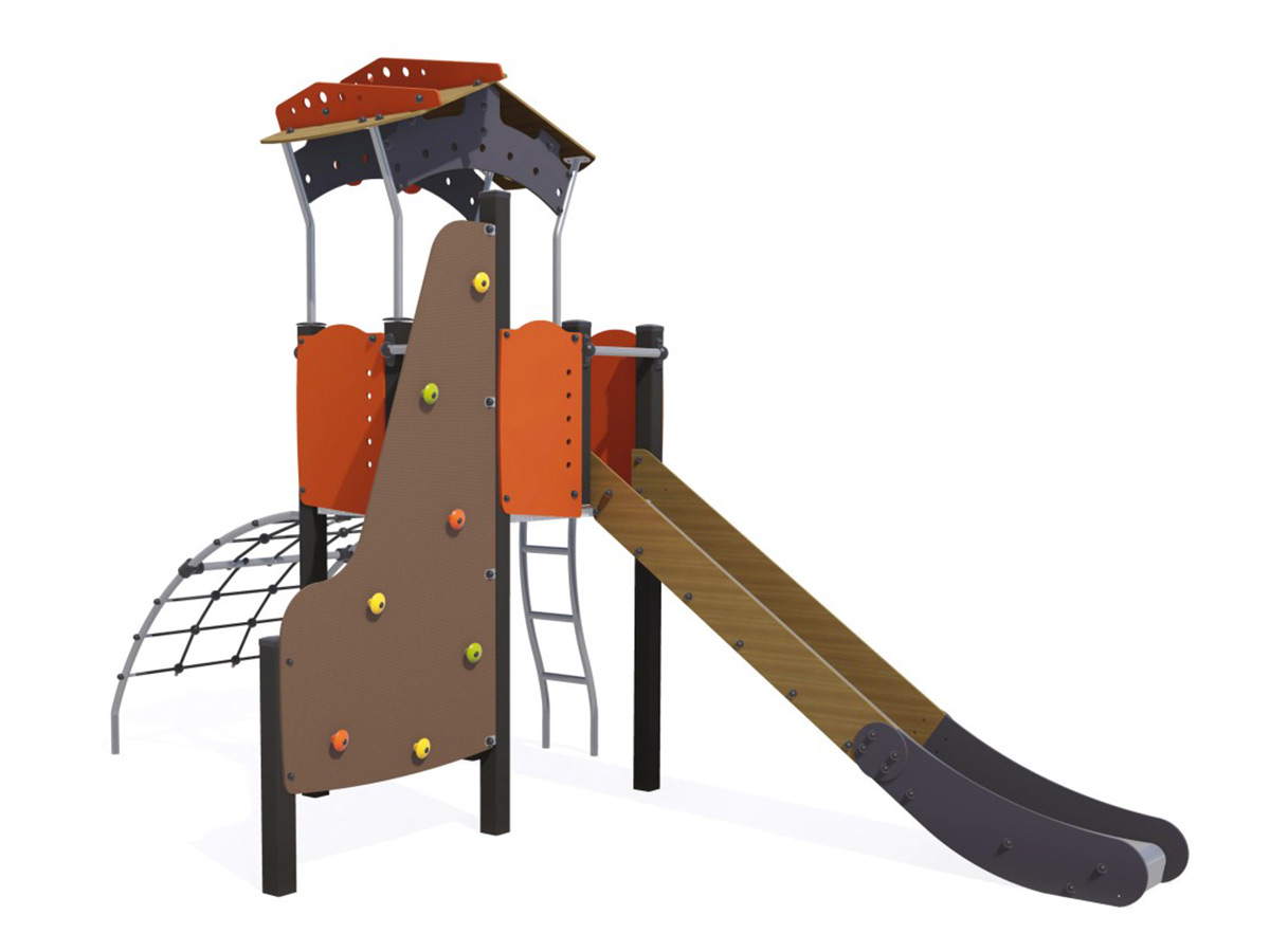 Materiais: Painéis coloridos de HPL com 13 mm de espessura, com excelente resistência a intempéries e vandalismo. As plataformas e a parede de escalada são feitas de um material compacto texturizado e antiderrapante (HPL), com 12,5 mm de espessura. Tubos de aço inoxidável, com diâmetro 40mm. Fixações de poliamida moldada por injeção conectam os postes às plataformas e aos vários acessórios de jogo. Elas são não tóxicas, não inflamáveis, resistentes a choques e a radiação ultravioleta. A espessura da poliamida torna o equipamento forte e resistente ao vandalismo. Postes quadrados com 95mm feitos de aço galvanizado lacado, garantindo robustez e durabilidade, com tampas de poliamida moldada por injeção. As cordas são feitas de cabo de aço galvanizado coberto com polipropileno, e os cabos são ligados e mantidos no lugar por conectores de poliamida moldada por injeção. A superfície deslizante do escorrega é feita de aço inoxidável com 2 mm de espessura, moldado, dobrado e enrolado em uma única peça. Presas de escalada de polipropileno, não tóxicas, não inflamáveis e resistentes a choques e radiação UV. Fixações de aço inoxidável, protegidas por tampas antivandalismo em poliamida.