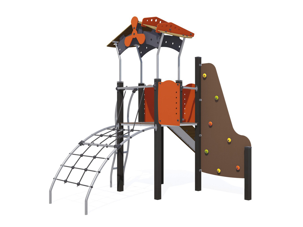 Torre de actividades temática Metropolis, composta por 1 escada metálica curva, que dá acesso a 1 torre temática, com plataforma quadrangular a 1,37m de altura, com guardas, com um telhado decorado com uma hélice, 1 rede inclinada com 1,37m de altura, 1 parede de escalada com presas coloridas, com 2,6m de altura e 1 escorrega com 1,37m de altura. Ideal para escorregar, esconder, trepar, escalar, manusear, brincar ao “faz de conta”, socializar, estímulo visual, tátil e cognitivo.