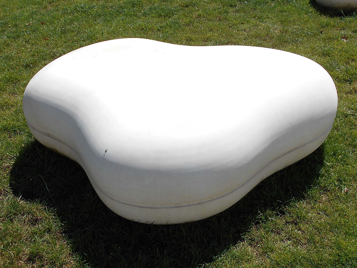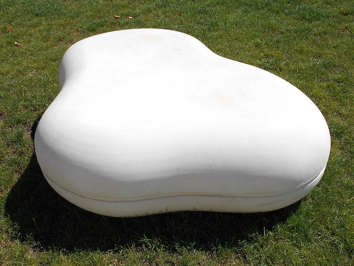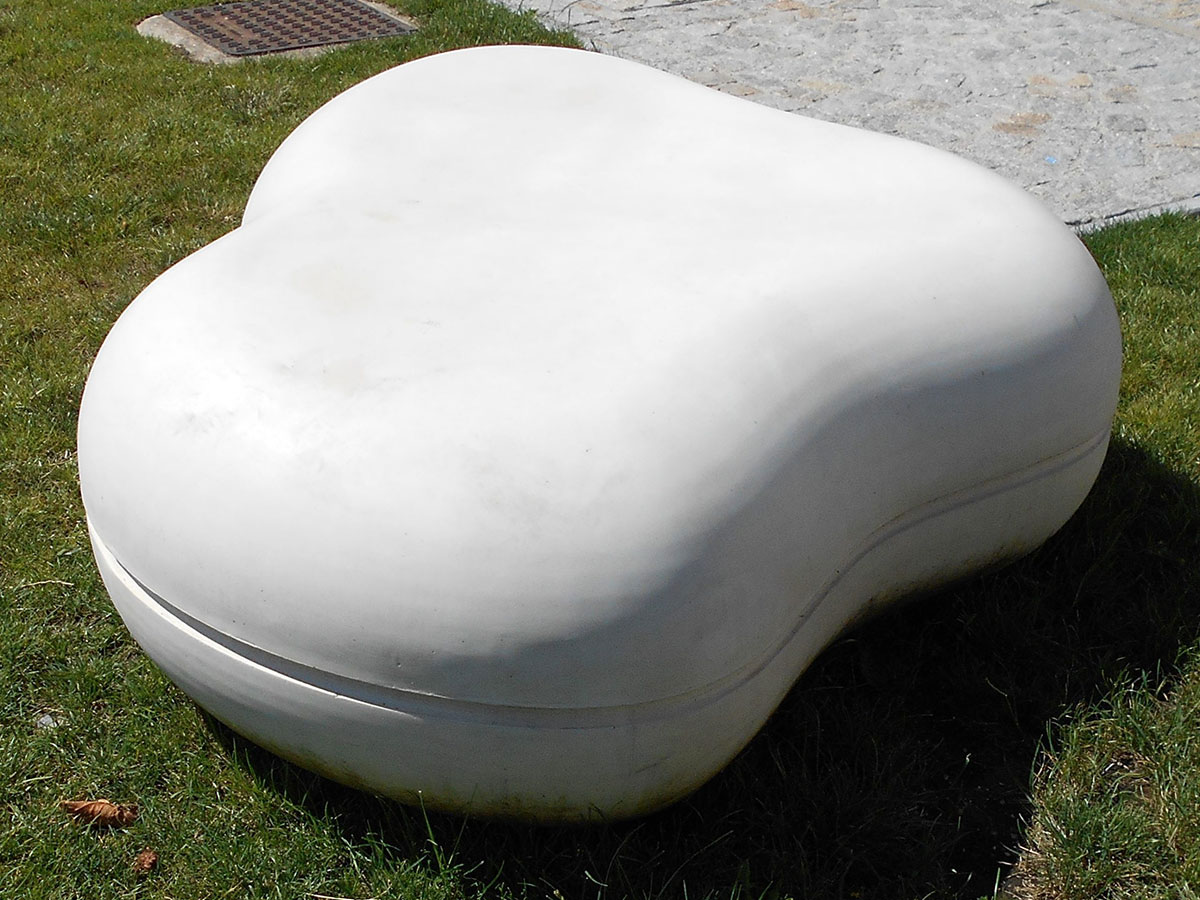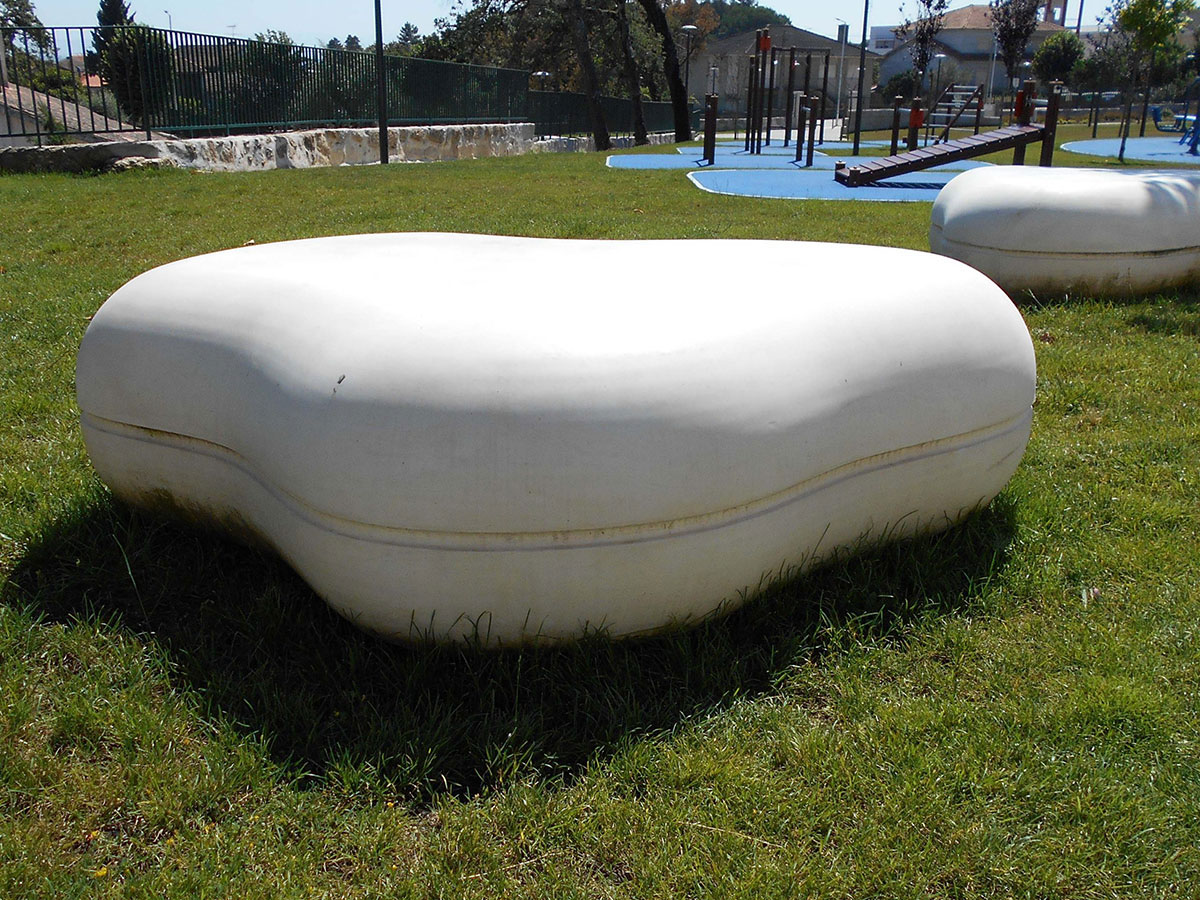 Banco tipo espregiçadeira em forma de núvem, sem costas, pré-fabricado em betão. Acabamento liso, texturado, lavado e/ou polido.